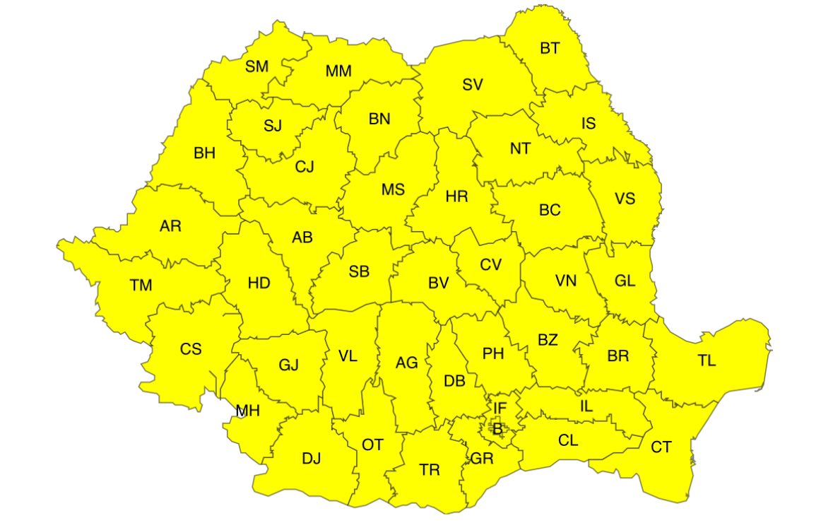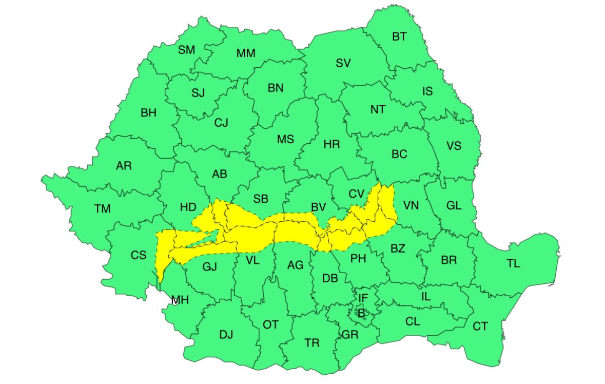 - Cod Galben (19 mai, ora 21 – 20 mai, ora 6): Intensificări ale vântului (90-100 km/h) în Carpații Meridionali și de Curbură, la altitudini peste 1700 m.