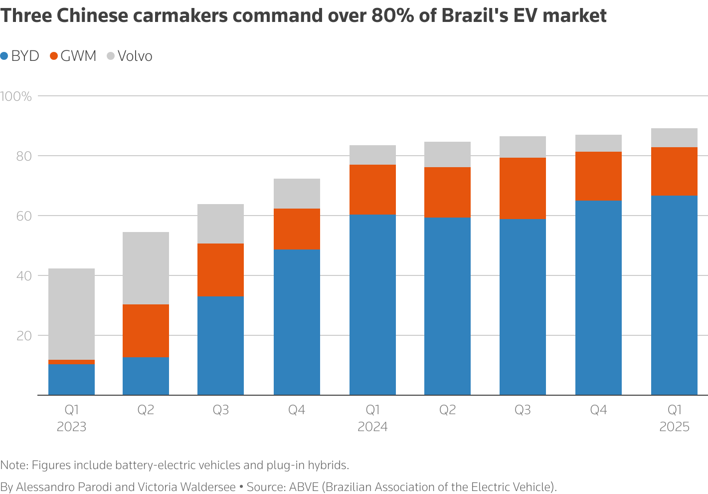 Pentru a contracara această tendință, grupurile industriale și sindicatele fac lobby pe lângă guvernul brazilian să accelereze cu un an planul de majorare a tarifelor la importurile de vehicule electrice de la 10 la 35%, în loc să le introducă treptat până în 2026. În 2015, Brazilia eliminase tarifele pentru a stimula adoptarea vehiculelor electrice, dar anul trecut a reintrodus o taxă de 10% pentru a încuraja investițiile locale.