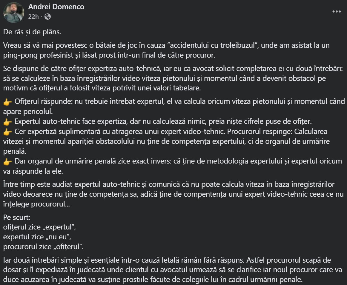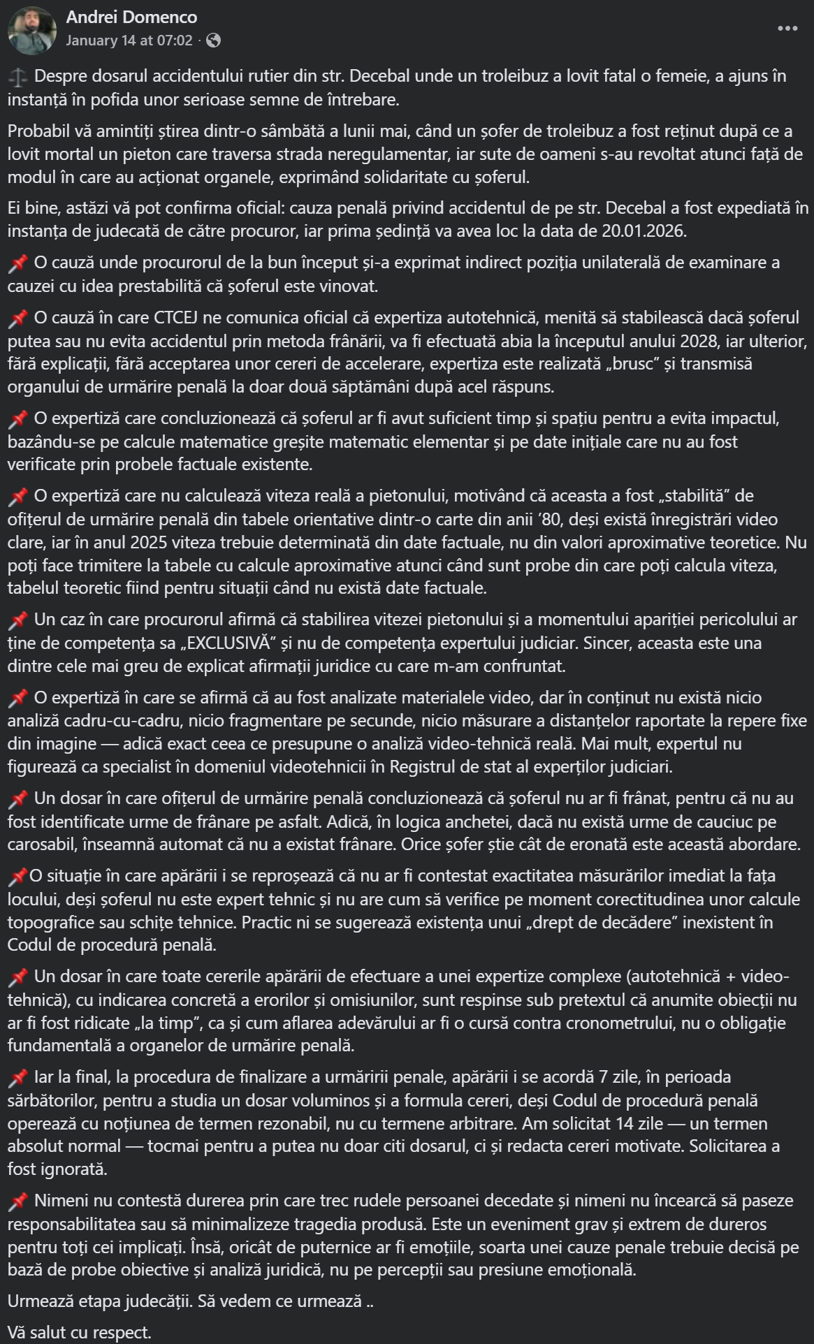 Expertiza judiciară a stabilit că șoferul troleibuzului dispunea de posibilitatea tehnică de a evita impactul prin aplicarea frânării în momentul apariției obstacolului (pietonului) pe bd. Decebal. Vezi aici cum s-a întâmplat accidentul.