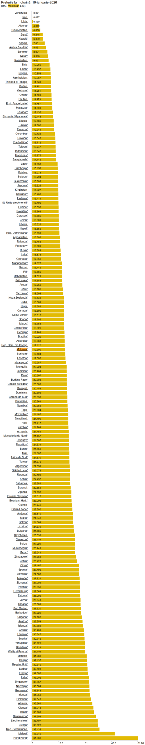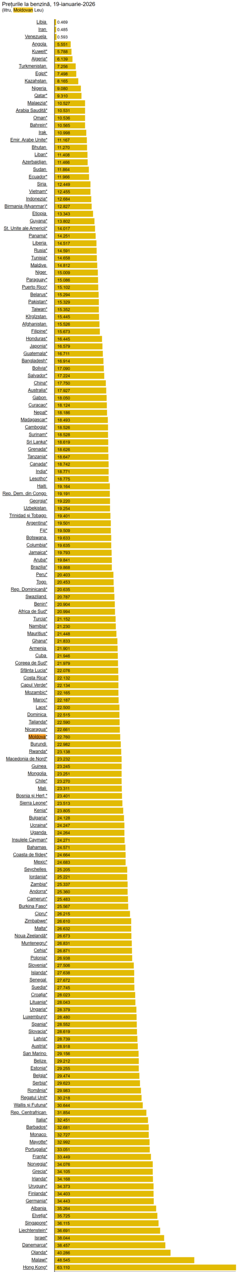 Iată unde stă Moldova în lista țărilor, la capitolul preț pentru benzină și motorină, conform ultimelor date afișate pe portalul GlobalPetrolPrices, la începutul lui 2026: