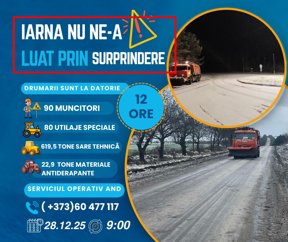 AND informează că traseele naționale sunt practicabile, iar accesibilitatea infrastructurii rutiere este asigurată în condiții de iarnă pe întreaga rețea de drumuri naționale.