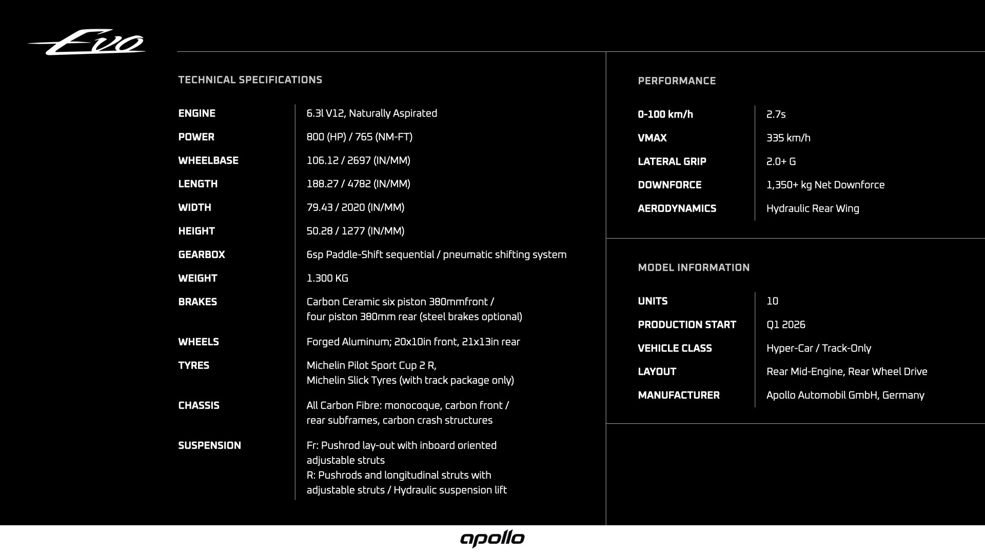 Apollo Automobil GmbH, singurul producător german dedicat exclusiv hypercar-urilor, a dezvăluit specificațiile complete de producție ale modelului Apollo EVO – un automobil radical, destinat exclusiv circuitelor, limitat la doar 10 exemplare. Primul EVO este deja în producție, iar livrările sunt programate să înceapă din prima jumătate a anului 2026.