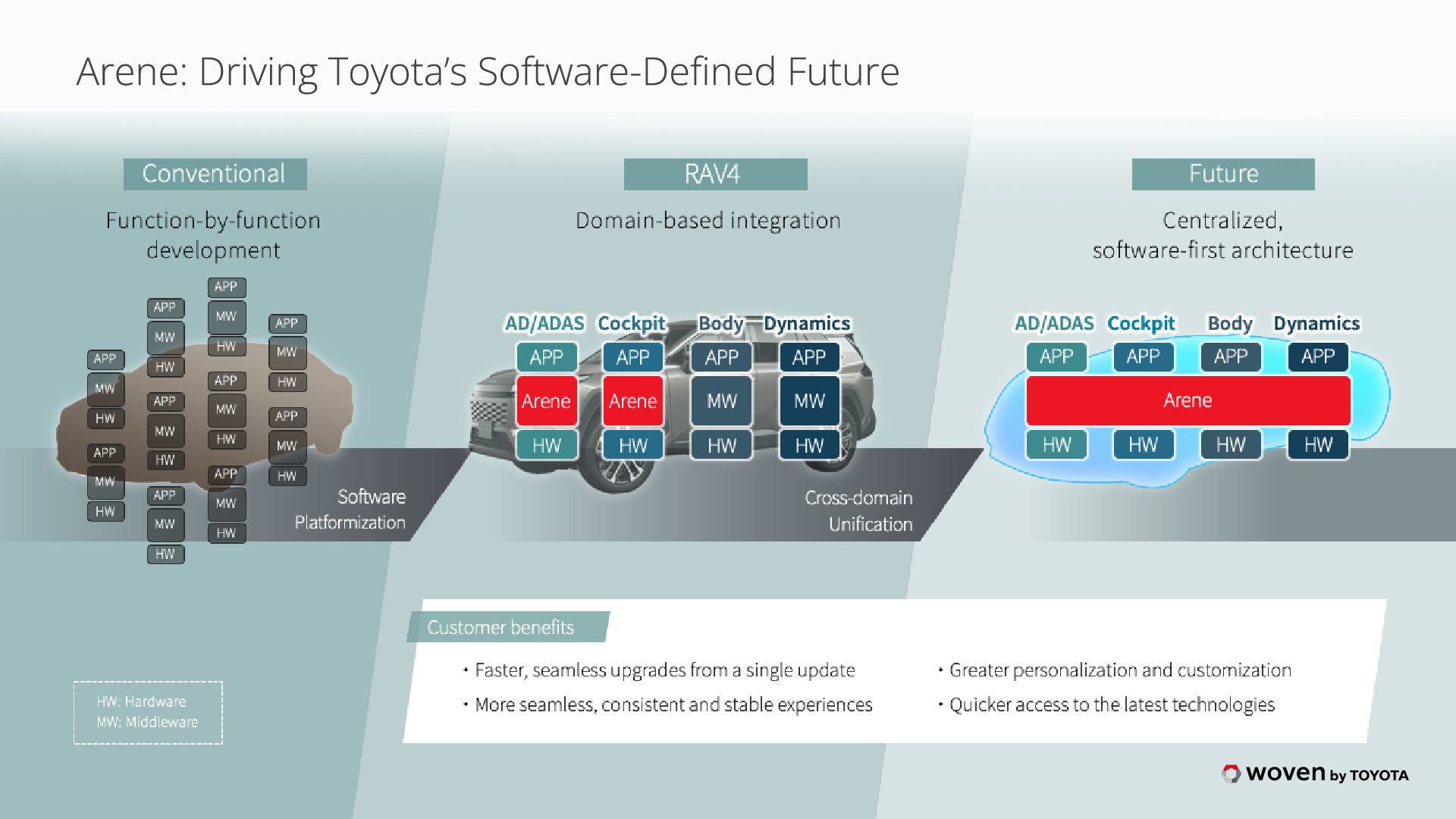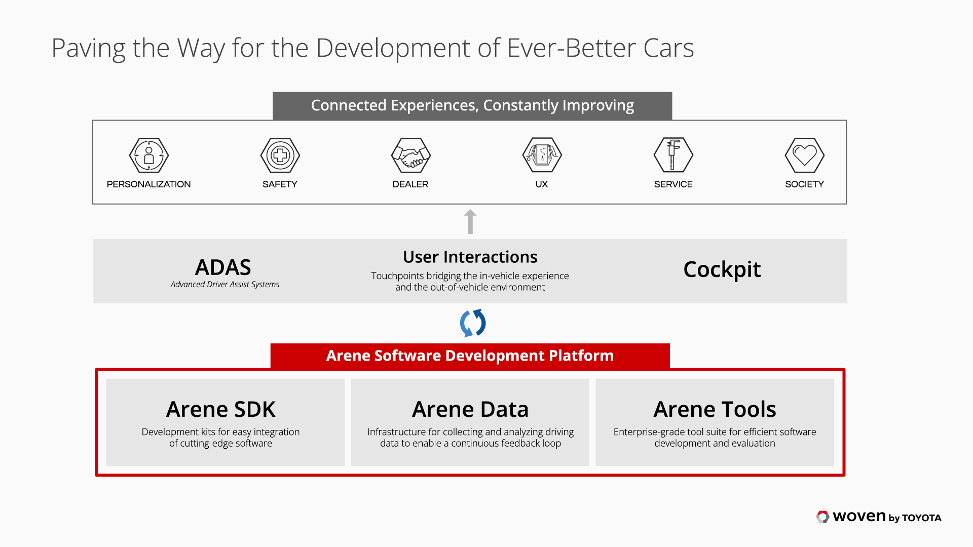 Prin aplicarea expertizei Toyota în producție la ingineria software modernă, Arene oferă o abordare unificată și centrată pe utilizator, permițând dezvoltarea de componente software modulare care pot fi reutilizate pe mai multe modele și aplicații. Aceasta elimină dependențele tradiționale dintre hardware și software, care necesitau dezvoltări personalizate pentru fiecare model de vehicul, accelerând astfel inovația.