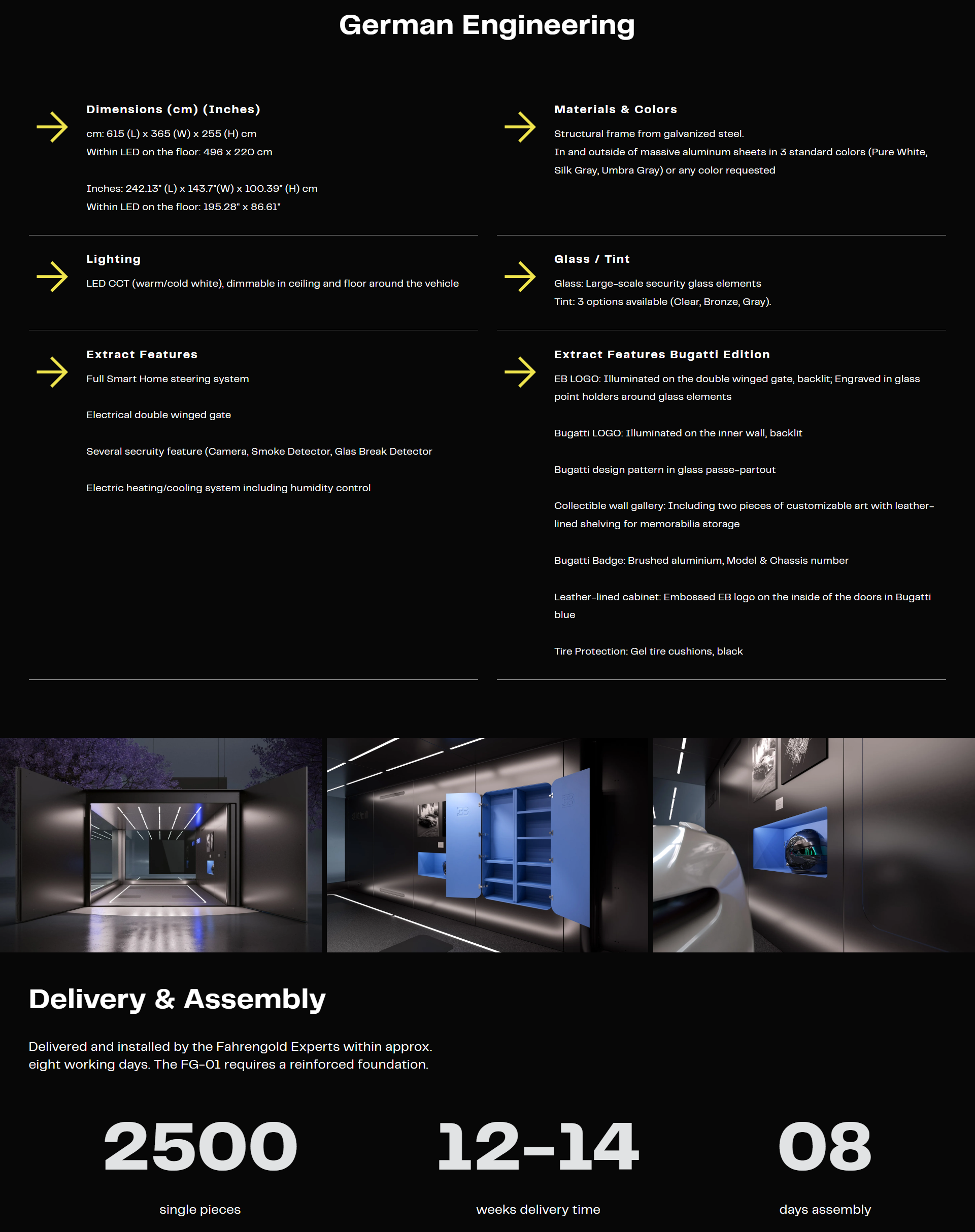 FG-01 servește drept vitrina supremă pentru vehicule de lux – un cadru rafinat conceput pentru a onora estetica venerată Bugatti. Sistemele sale avansate de securitate, reglarea temperaturii și a umidității, precum și decorul de tip galerie garantează că mașinile hiper-sportive nu sunt doar protejate, ci și celebrate.