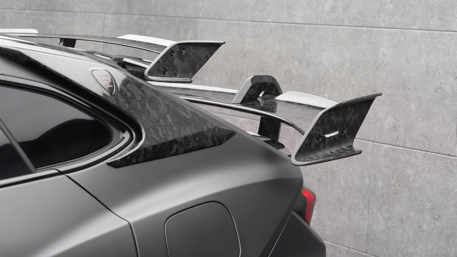 - Posteriorul conține pe hayon ditamai două aripi, ambele din fibră de carbon, care contribuie activ la reducerea forței de ascensiune și mărirea celei de apăsare pe puntea din spate. Cel de la nivelul plafonului poate fi mic sau mare, la alegere