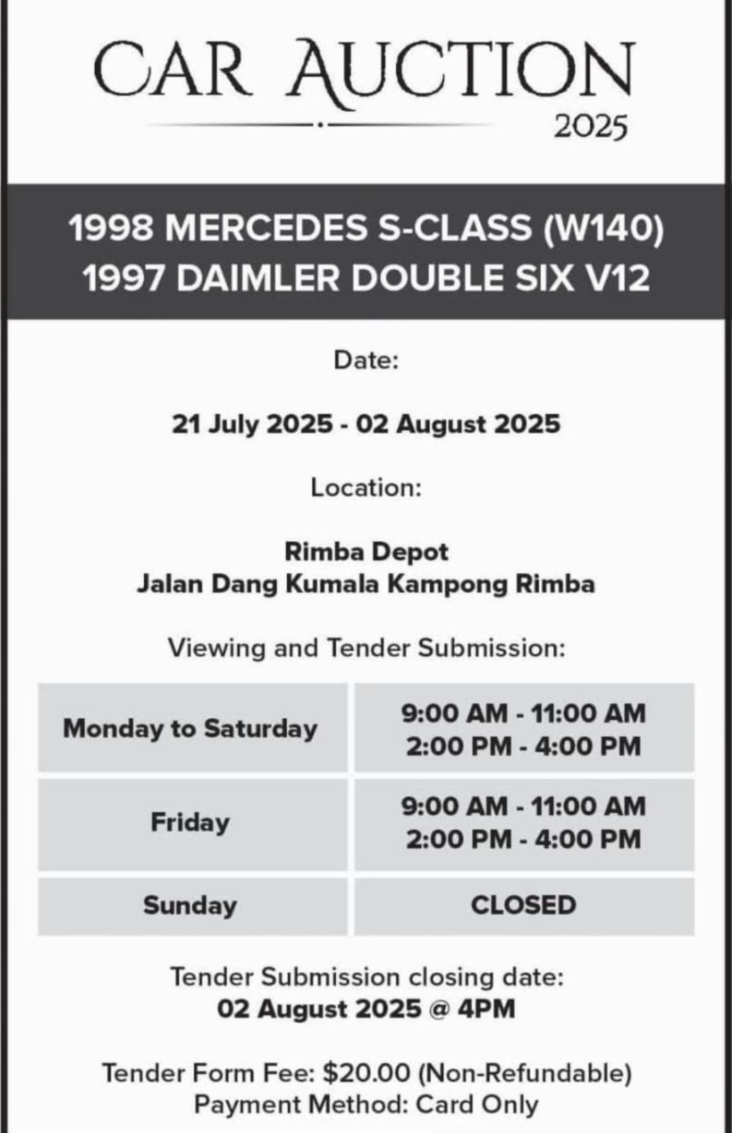 Mașinile se află în Brunei și au fost toate proprietatea guvernului din Brunei. Se pun la dispoziție 25 de sedanuri 600 SEL negre (V12 de 6.0 litri, 408 CP), 13 sedanuri 500 SEL negre și alte nouă de culoare verde (V8 de 5.0 litri, 326 CP), alături de 24 de unități Daimler Double Six negre (din 1230 produse vreodată cu V12 de 6.0 litri, marca Jaguar, 320 CP). Toate au volanul pe dreapta și un interior din piele neagră.