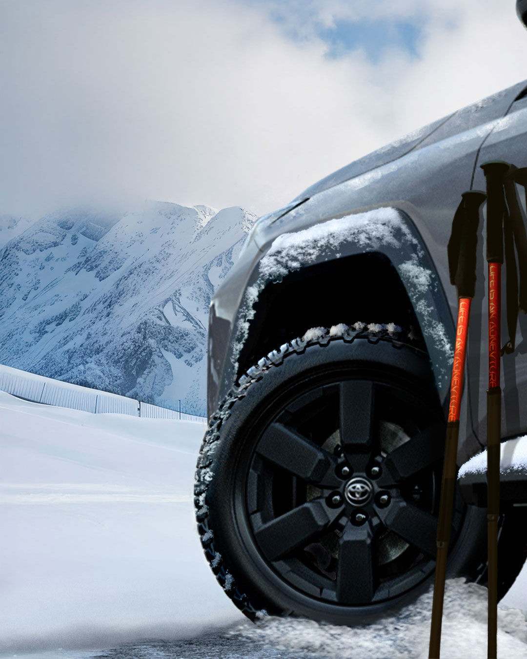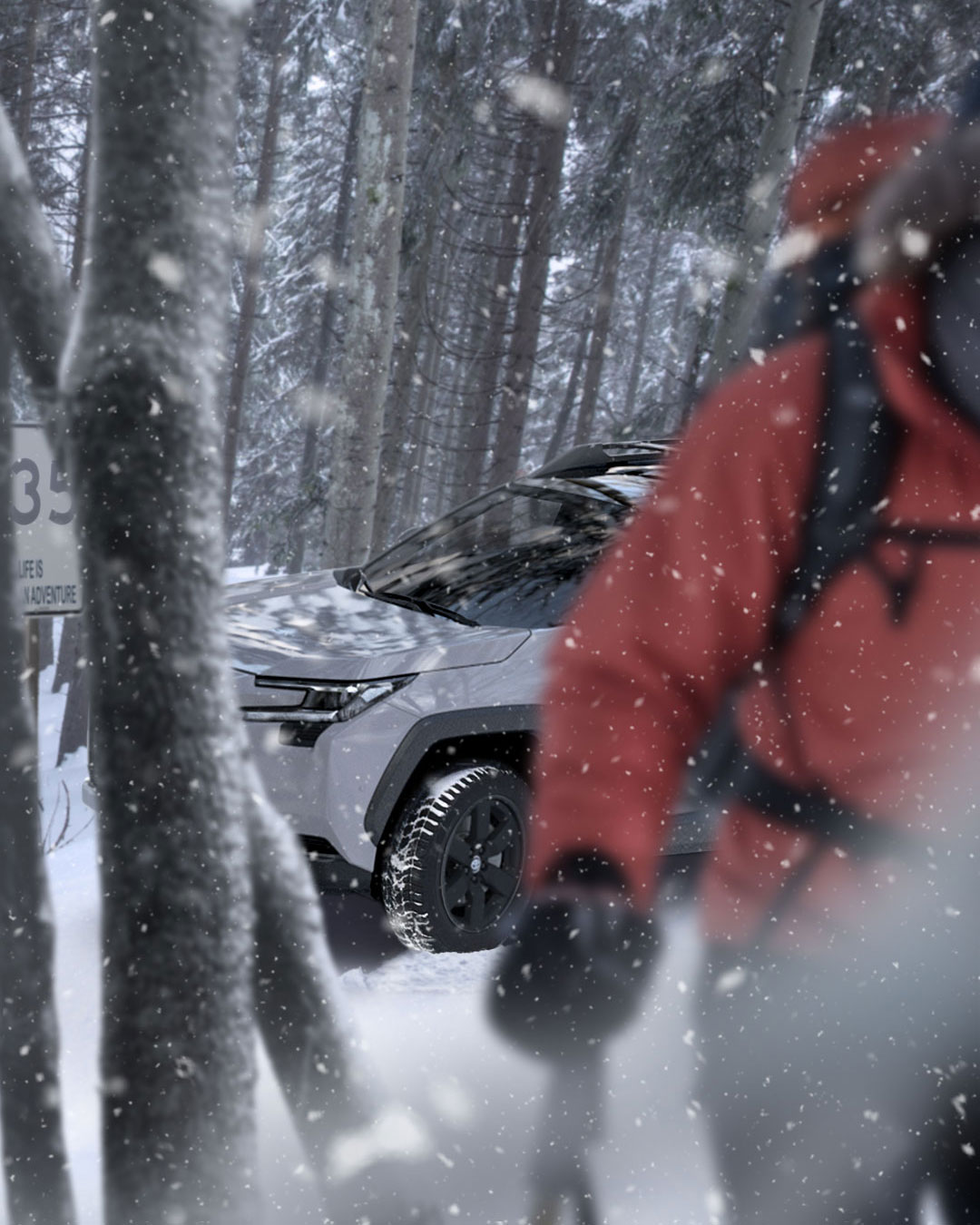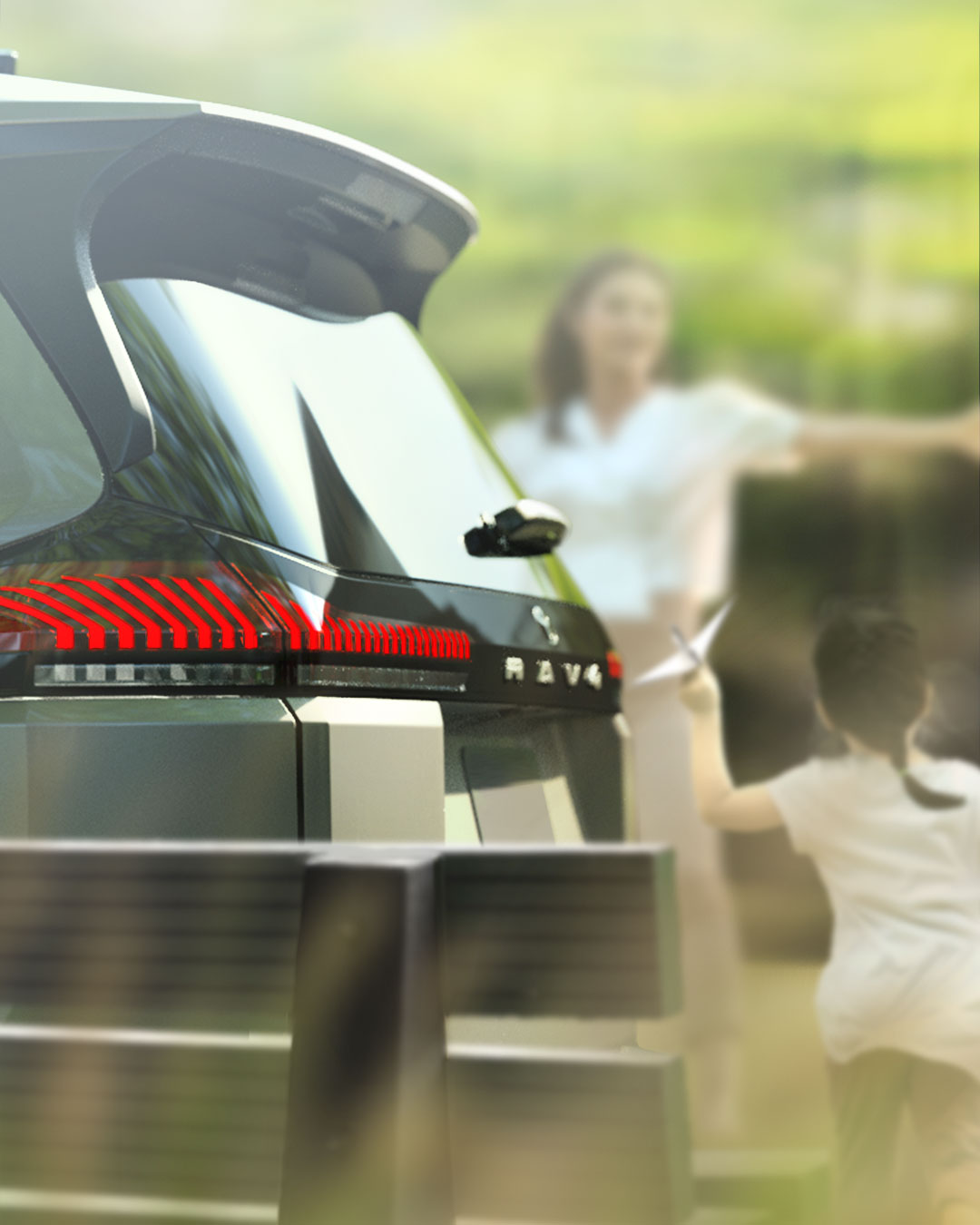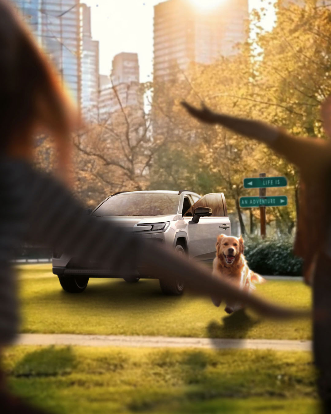 Corpul modelului include un spoiler generos pe ușa portbagajului și anvelope off-road, sugerând lansarea din start și a variantei Adventure. Sloganul „Life is an adventure” („Viața este o aventură”), prezent în materialele teaser, indică poziționarea noului RAV4 drept un companion ideal pentru iubitorii de natură și activități în aer liber, scenarii naturale fiind alese pentru fotografiile promoționale.
