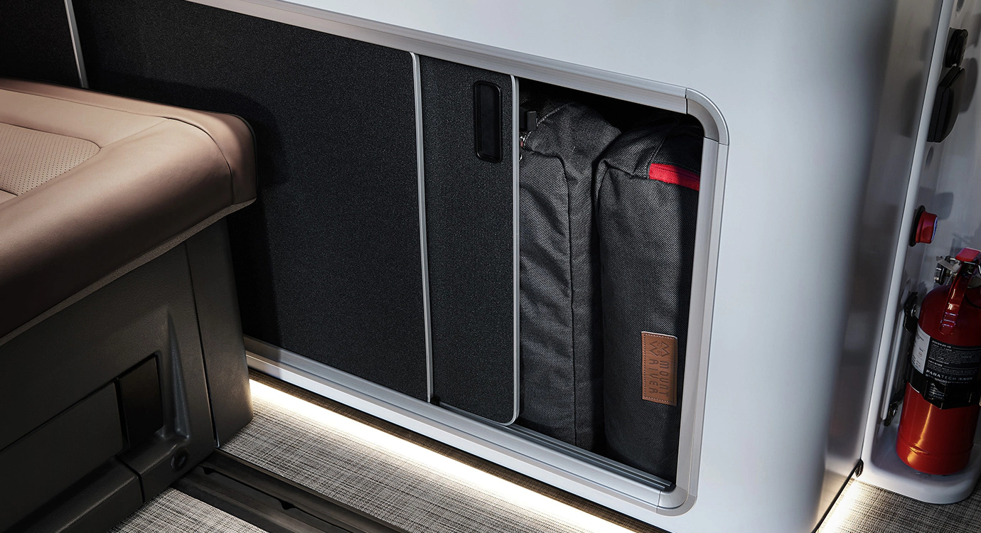 Mai există prize de uz casnic, iluminare LED avansată, iar sub tavan este fixat un ecran tactil de 12.1 inci, de pe care pot fi controlate toate sistemele de la bordul compartimentului de locuit.