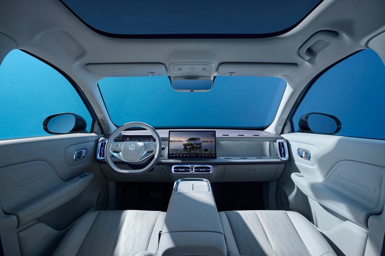 Interiorul dezvăluie un caracter unic, oferind o atmosferă luminoasă și spațioasă. Un ecran tactil plutitor de 14.6 inchi domină centrul planșei de bord, creând un punct focal high-tech. Dispunerea cabinei este funcțională și primitoare, cu configurații versatile ale scaunelor care transformă spațiul într-o zonă de odihnă confortabilă.