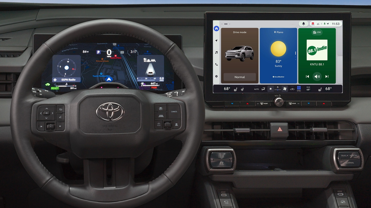Pentru prima dată, experiența multimedia într-o cabină de Toyota este mai strâns legată de afișajul multi-informațional (MID). Navigația nativă este acum disponibilă full screen, permițând hărți și direcții viraj-cu-viraj vizibile în panoul digital de instrumente, direct în spatele volanului pentru ușurința șoferului sporită.