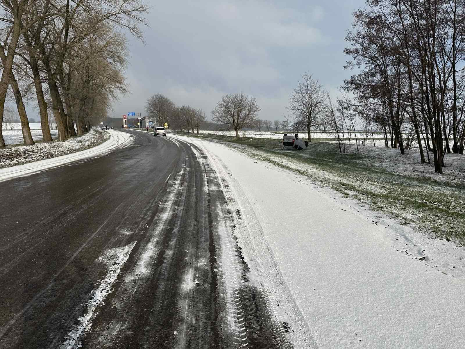 (foto) O șoferiță s-a răsturnat în raionul Edineț din cauza ninsorii