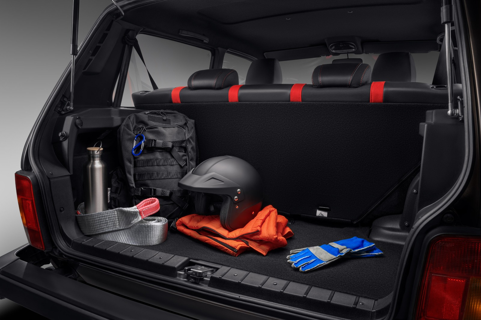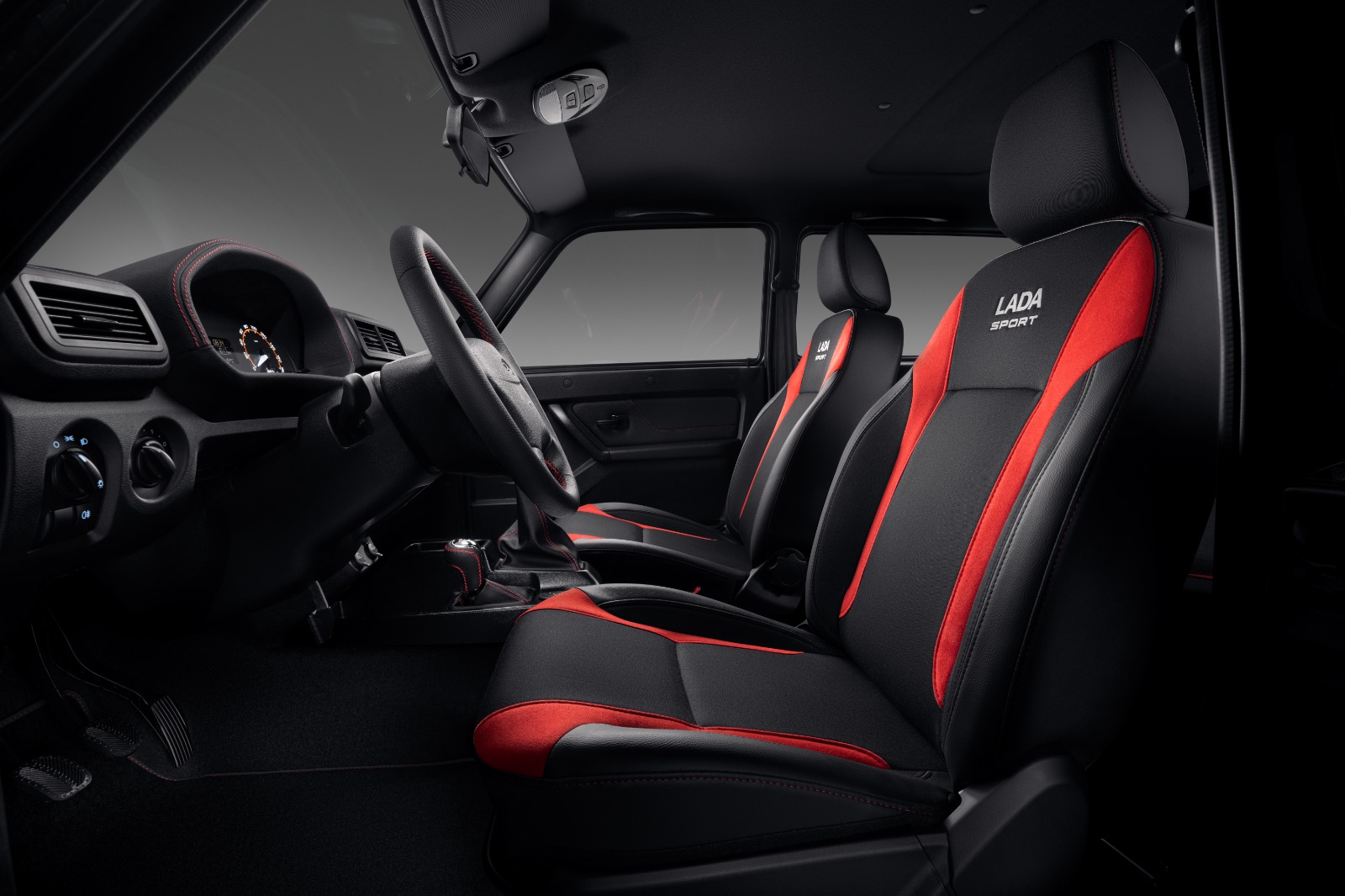 - Interior dinamic: Habitaclul în tonuri negru-roșu prezintă logoul LADA Sport pe scaune, volan reglabil îmbrăcat în piele și manete unice pentru cutia de viteze și cea de transfer.