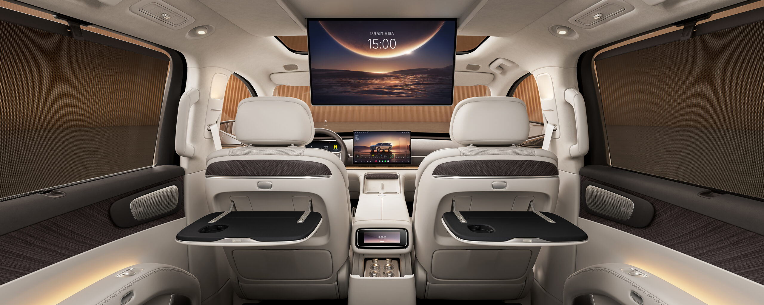 Pasagerii din spate vor avea acces la unele comenzi printr-un mic ecran multifuncțional de 6 inchi deasupra frigiderului. Iar de conținut video se vor putea bucura prin intermediul unui monitor de 21.4 inchi cu o rezoluție 3K (cu certificare Rheinland pentru lumină albastră scăzută). Apropo tavanul include două secțiuni separate de sticlă.