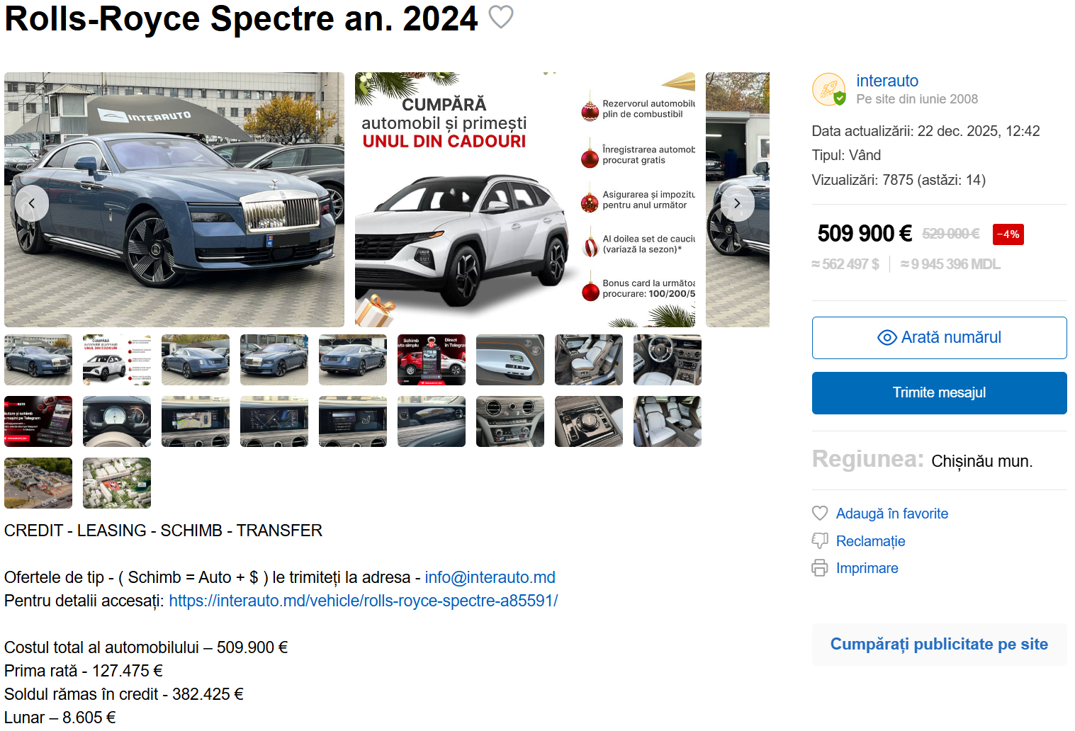 Înmatriculat pentru… a fi vândut! După ce a fost surprins ieri lângă un birou de înmatriculare din Chișinău, peste noapte, primul Rolls-Royce Spectre cu numere de Moldova a fost scos la vânzare. Iar vânzător nu este o persoană privată, ci o parcare auto.