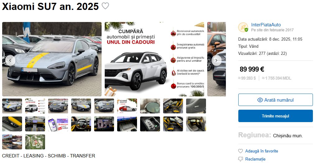 Rapid s-a plictisit proprietarul? Primul Xiaomi SU7 Ultra care a fost importat și înmatriculat în Republica Moldova a fost scos la vânzare. Deși are 5000 de km parcurși pe odometru, se va încerca să se câștige o sumă frumușică pe seama exclusivității.