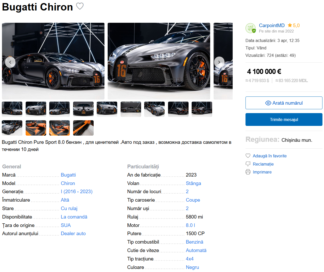 Anunț auto interesant și deocamdată unic în Republica Moldova. Un importator de mașini la comandă din Statele Unite ale Americii declară că poate aduce un Bugatti Chiron Pur Sport. Modelul a fost produs în doar 60 de exemplare și costa la momentul lansării trei milioane de euro fără taxe.