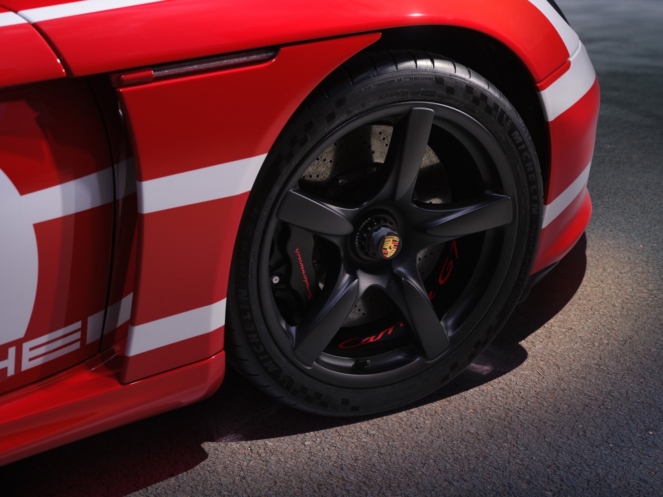 Aspectul individual include și carbon mat negru, care contrastează cu vopseaua roș-albă. Este folosit, printre altele, pentru jumătățile de plafon, montanții A și B, capacele oglinzilor exterioare, priza de aer în secțiunea frontală și difuzorul spate. Grilajele capacului motor sunt în negru mat anodizat. Jantele din aliaj ușor, negre, în designul original cu cinci spițe poartă o emblemă Porsche color pe centru și inscripția Carrera GT pe interior. Etrierii de frână au inscripția Sonderwunsch.