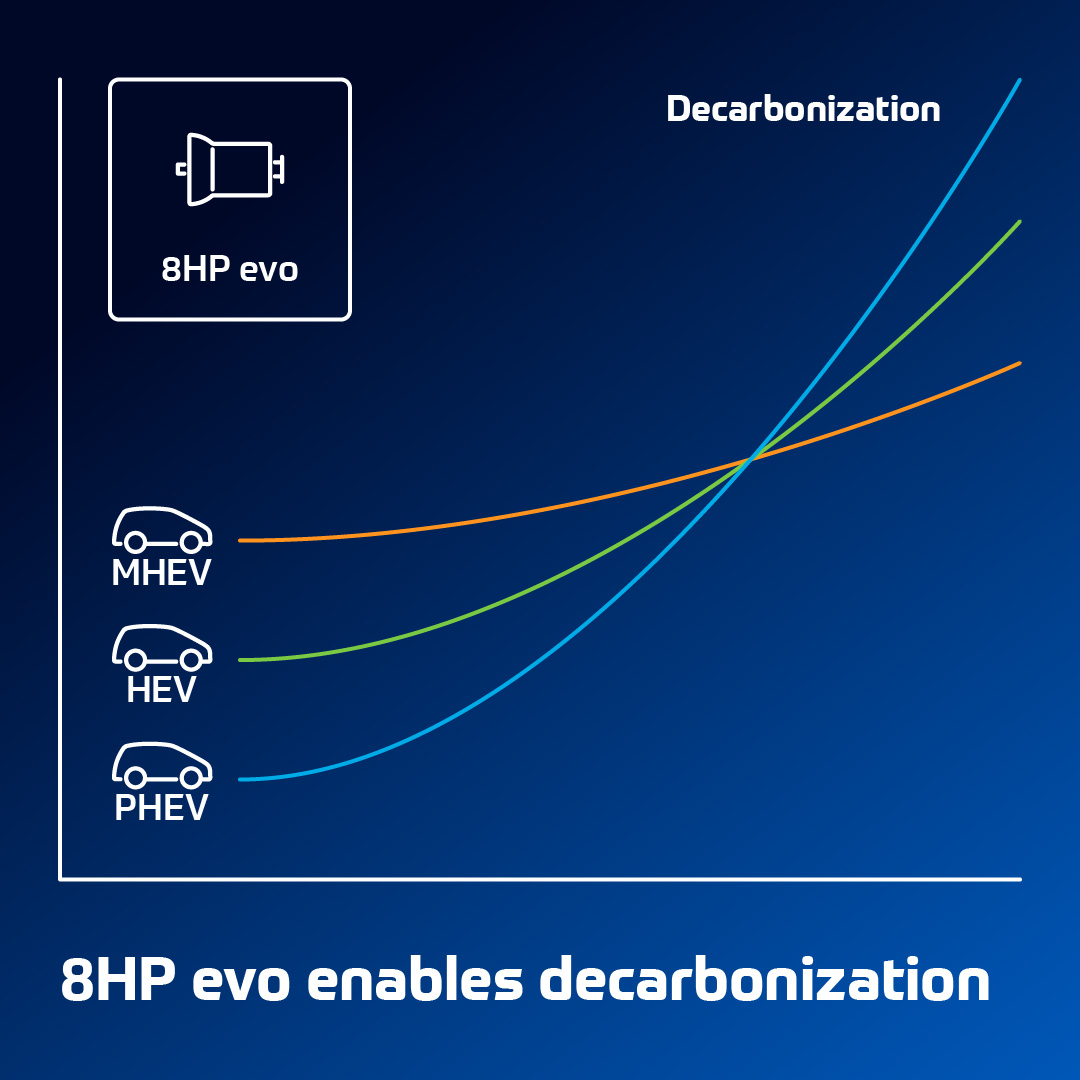 Transmisia automată cu 8 trepte a fost unul dintre cele mai de succes produse ale ZF, fiind proiectată încă de la început pentru a susține atât motoarele cu combustie, cât și motorizările hibride, conform principiului modular. Dezvoltarea 8HP evo duce electrificarea și eficiența la un nou nivel, reducând numărul de componente față de predecesorul direct, ceea ce o face mai ușoară și mai simplă în asamblare.