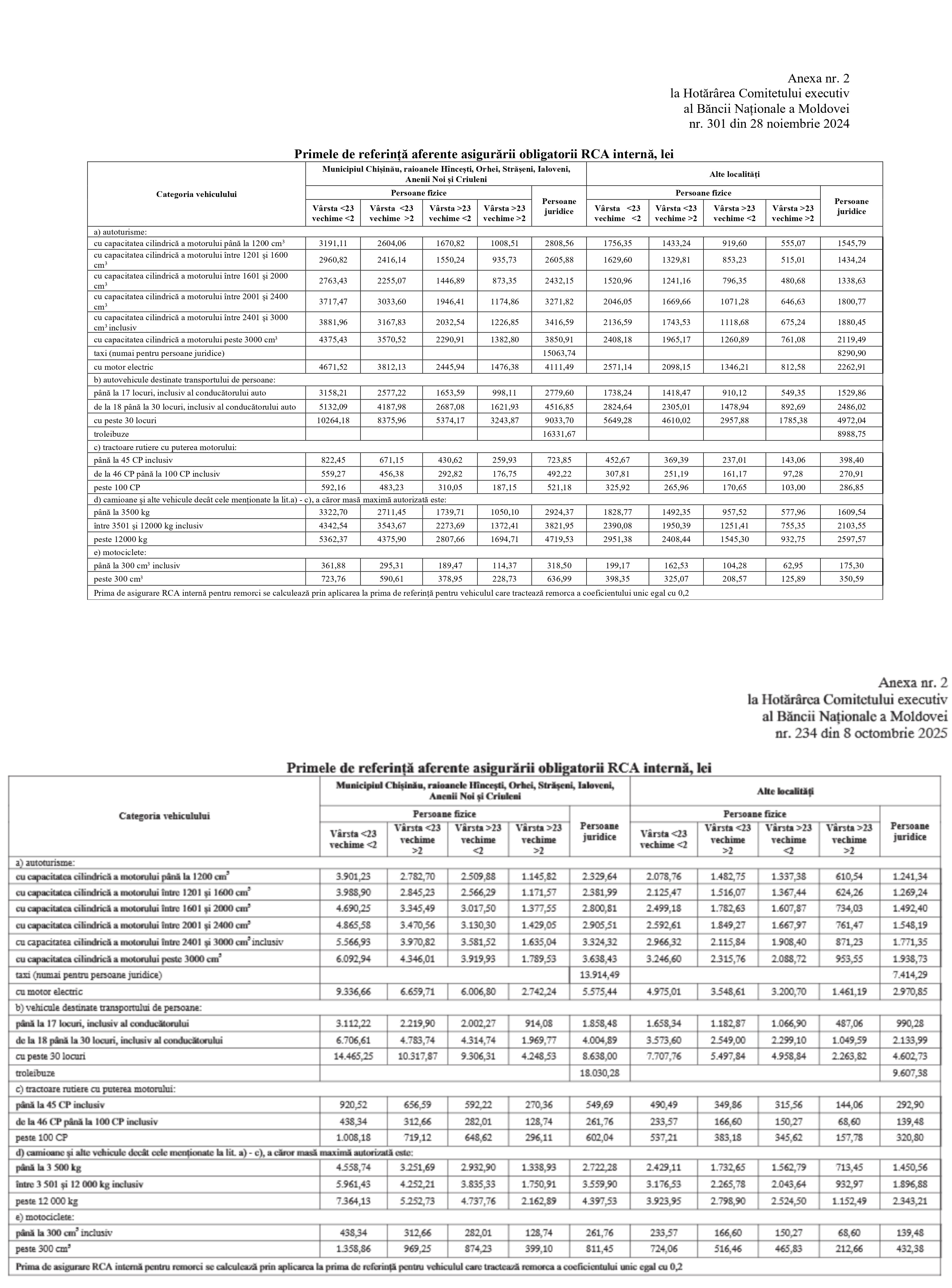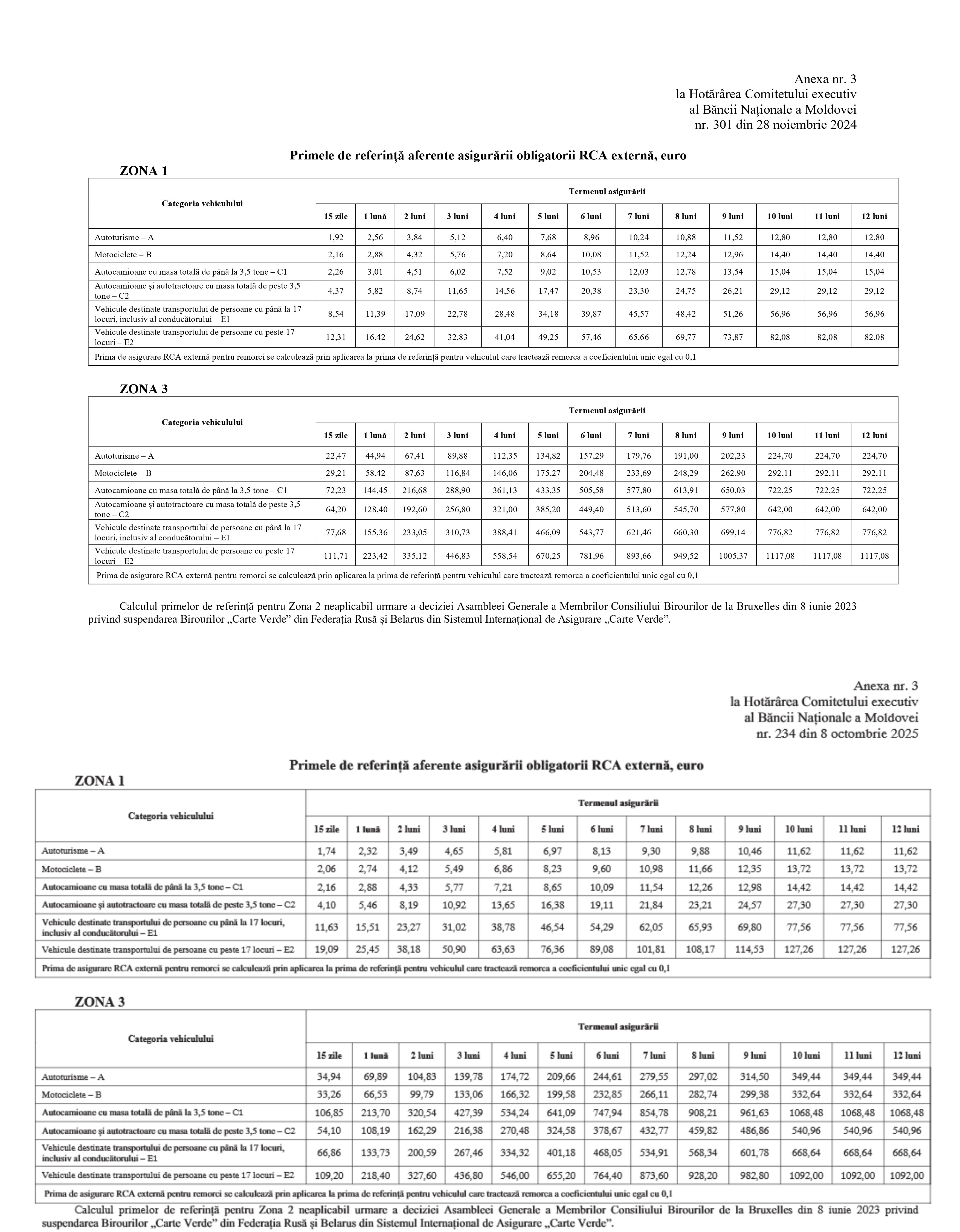 Pe 8 octombrie 2025, BNM a aprobat noile prime de asigurare de bază și coeficienți de rectificare pentru polițele de asigurare obligatorie de răspundere civilă auto (RCA), atât internă, cât și externă (Carte Verde). Pe 16 octombrie a fost publicată hotărârea în Monitorul Oficial, iar din 25 noiembrie va intra în vigoare.