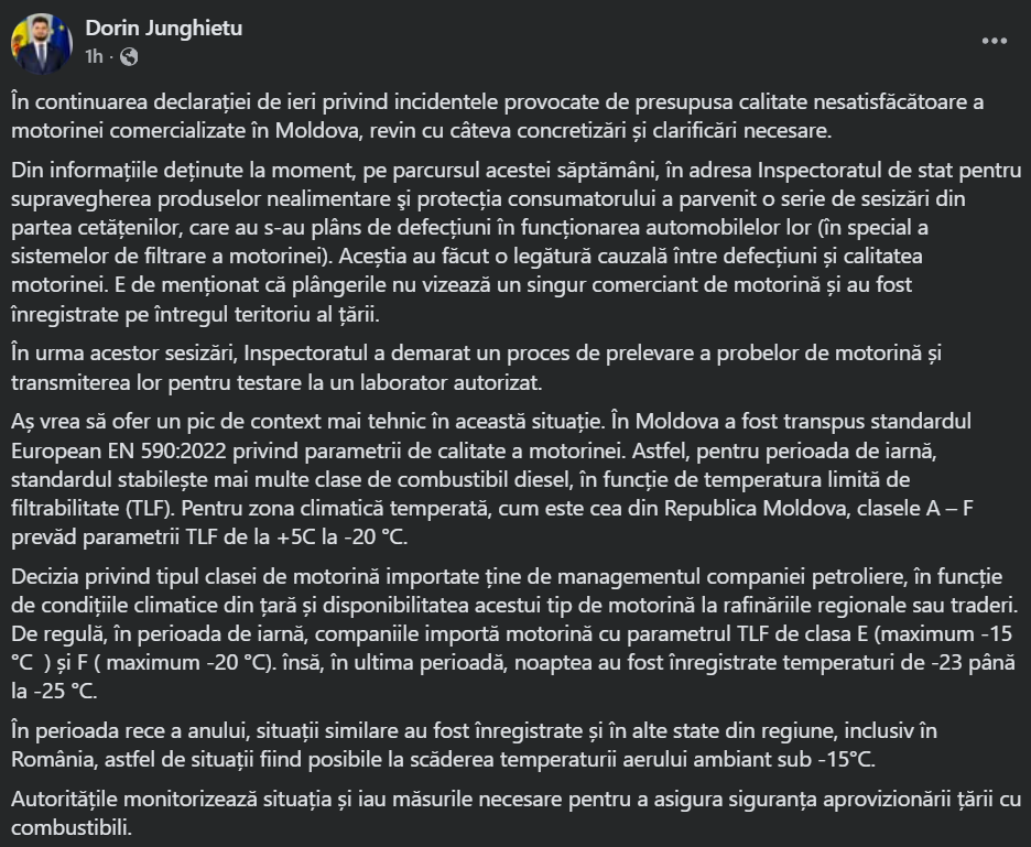 Ministrul Energiei, Dorin Junghietu, a revenit în această seară, urmare a declarațiilor de ieri, cu precizări în legătură cu sesizările masive ale șoferilor privind calitatea motorinei comercializate în Republica Moldova.