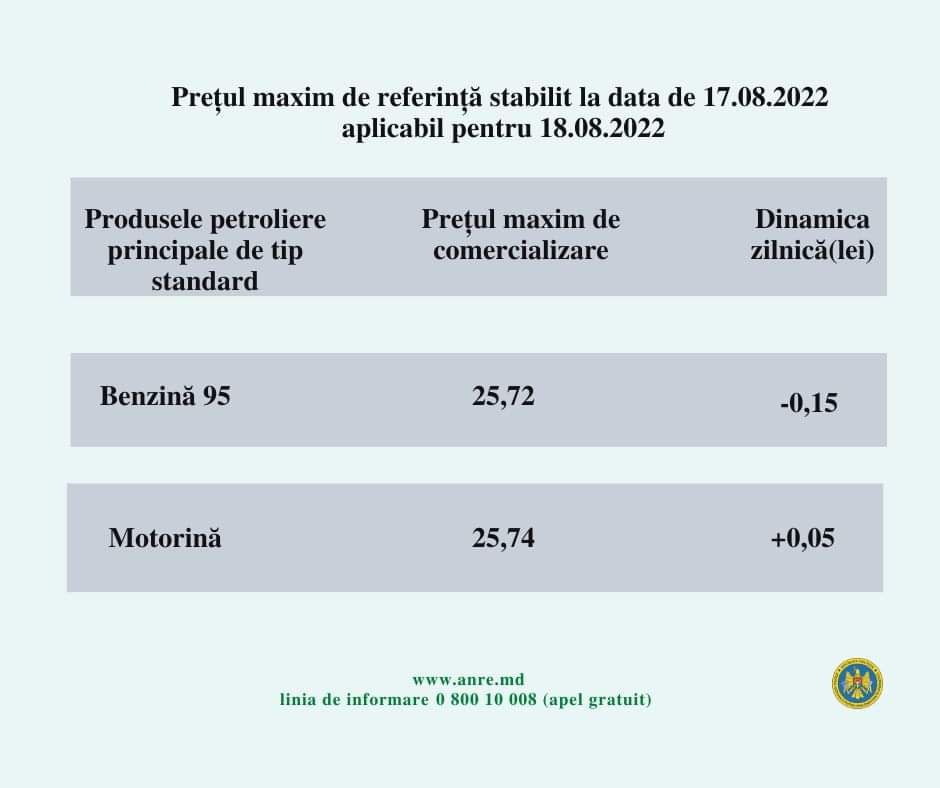 Pentru ziua de joi, 18 august, ANRE a stabilit următoarele preţuri plafon pentru principalele produse petroliere comercializate în staţiile de alimentare dintre Prut şi Nistru: