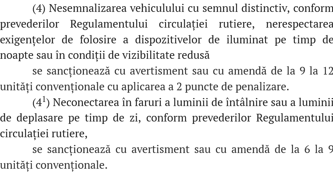 „(4) În caz de ceaţă densă, ploaie torenţială, ninsoare abundentă sau în alte condiţii similare, la autovehicule trebuie pusă în funcţiune lumina de întâlnire a farurilor sau farurile anti ceaţă.