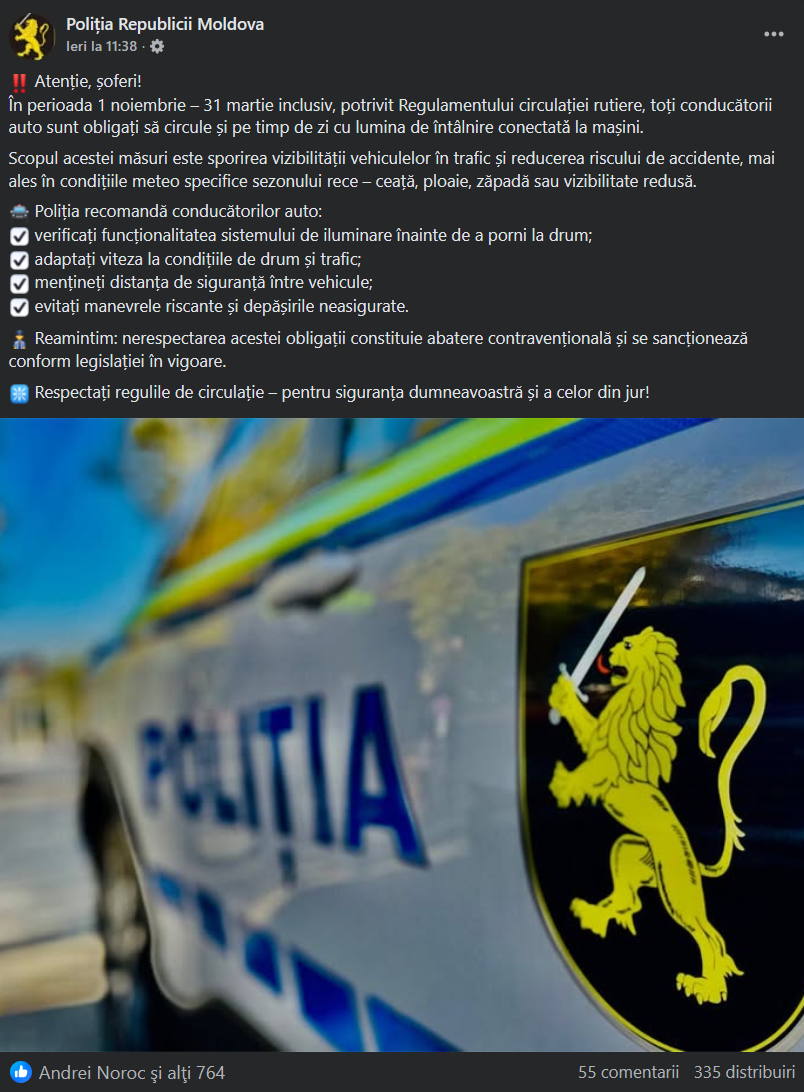 Începând cu 1 noiembrie, șoferii din Republica Moldova sunt obligați să circule cu luminile de întâlnire (faza scurtă) sau cu luminile de zi (DRL) aprinse în faruri chiar și pe timp de zi. Această obligație este valabilă până pe 31 martie inclusiv și vizează toate vehiculele, indiferent de condițiile de vizibilitate.
