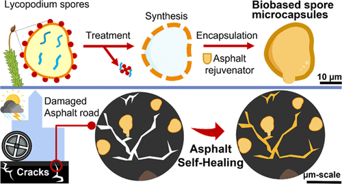Pentru a produce acest bitum, cercetătorii au adăugat mici spori vegetali poroși înmuiați în uleiuri reciclate. Atunci când suprafața drumului este comprimată în timpul traficului, sporii sunt storși, iar uleiul este împins în crăpăturile din apropiere. Uleiul înmoaie bitumul suficient încât acesta să poată curge și să sigileze fisurile.
