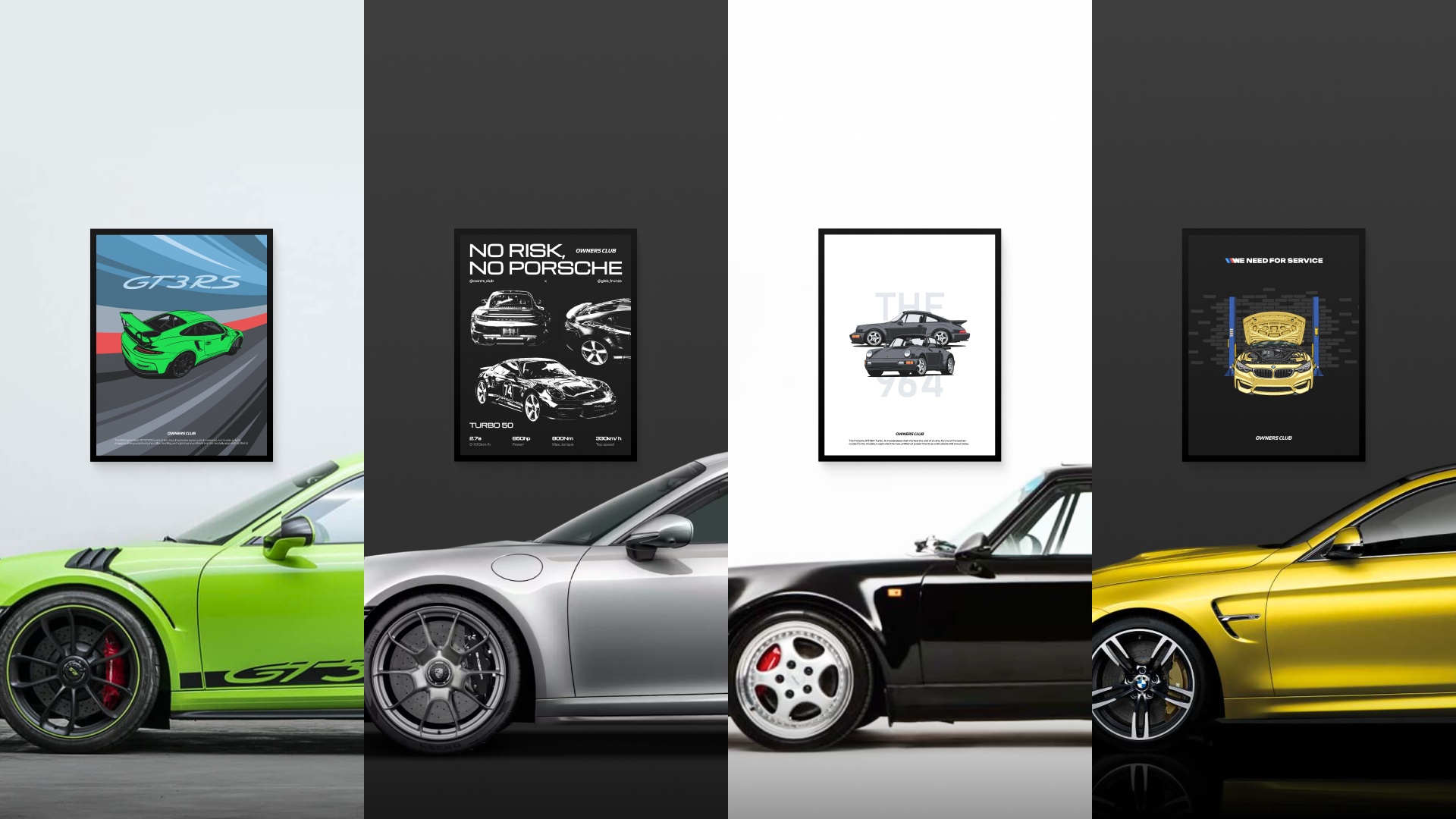 Pe lângă haine, Owners Club oferă și o colecție de postere auto, ideale pentru garaj, birou sau camera unui pasionat. De la modele Porsche, BMW, până la creații custom inspirate de motorsport, posterele adaugă personalitate oricărui spațiu.