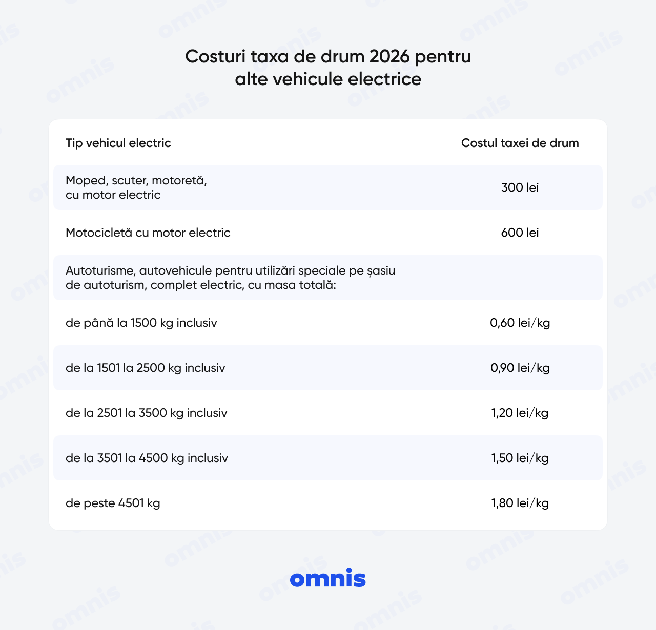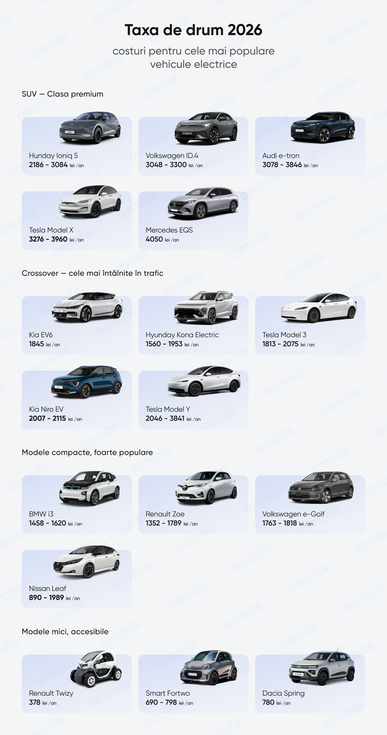 Pentru restul mașinilor care nu se regăsesc în acest calcul, mai jos este un tabel cu costurile taxei de drum pentru vehiculele electrice în 2026.