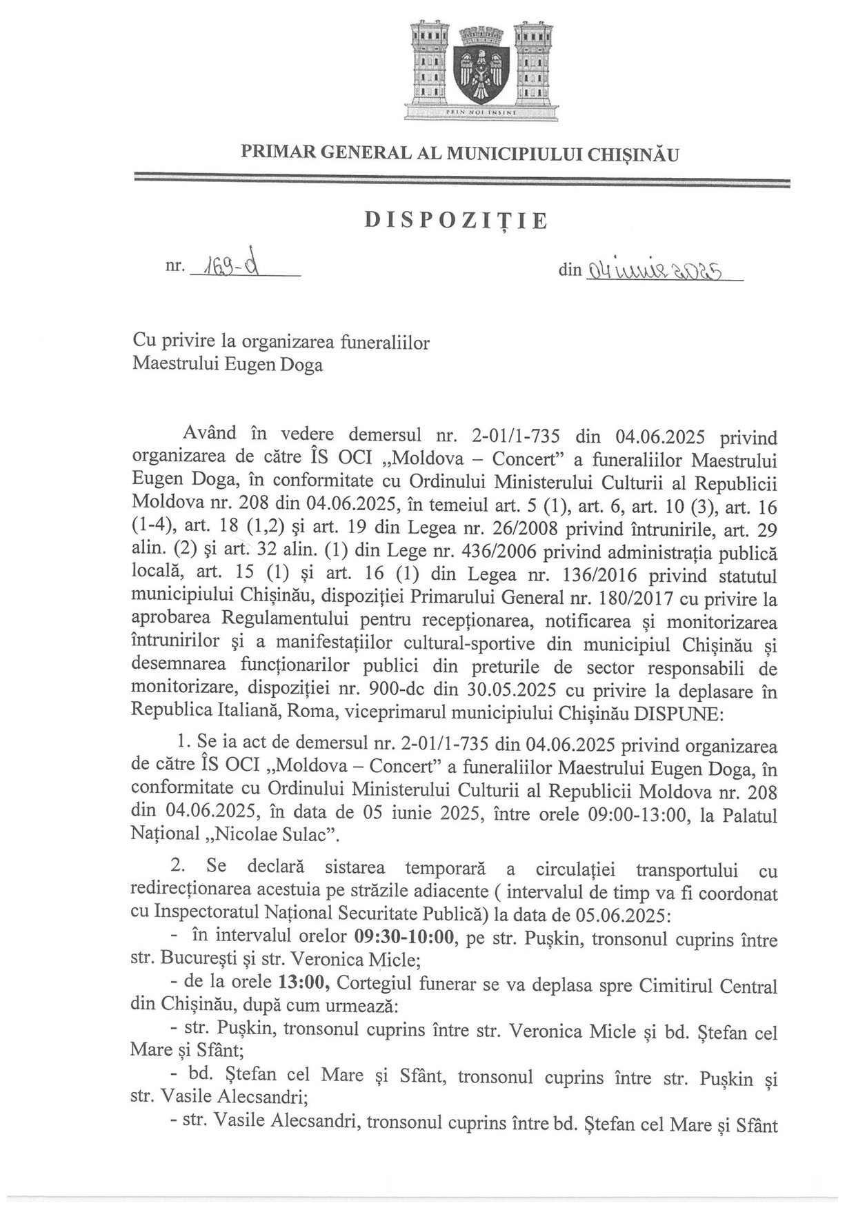 Poliția Națională a informat că astăzi, 5 iunie, începând cu ora 13:00, în legătură cu funeraliile compozitorului Eugen Doga, circulația rutieră va fi sistată pe mai multe artere din centrul capitalei. Până la ce oră vor fi active aceste restricții nu s-a anunțat.