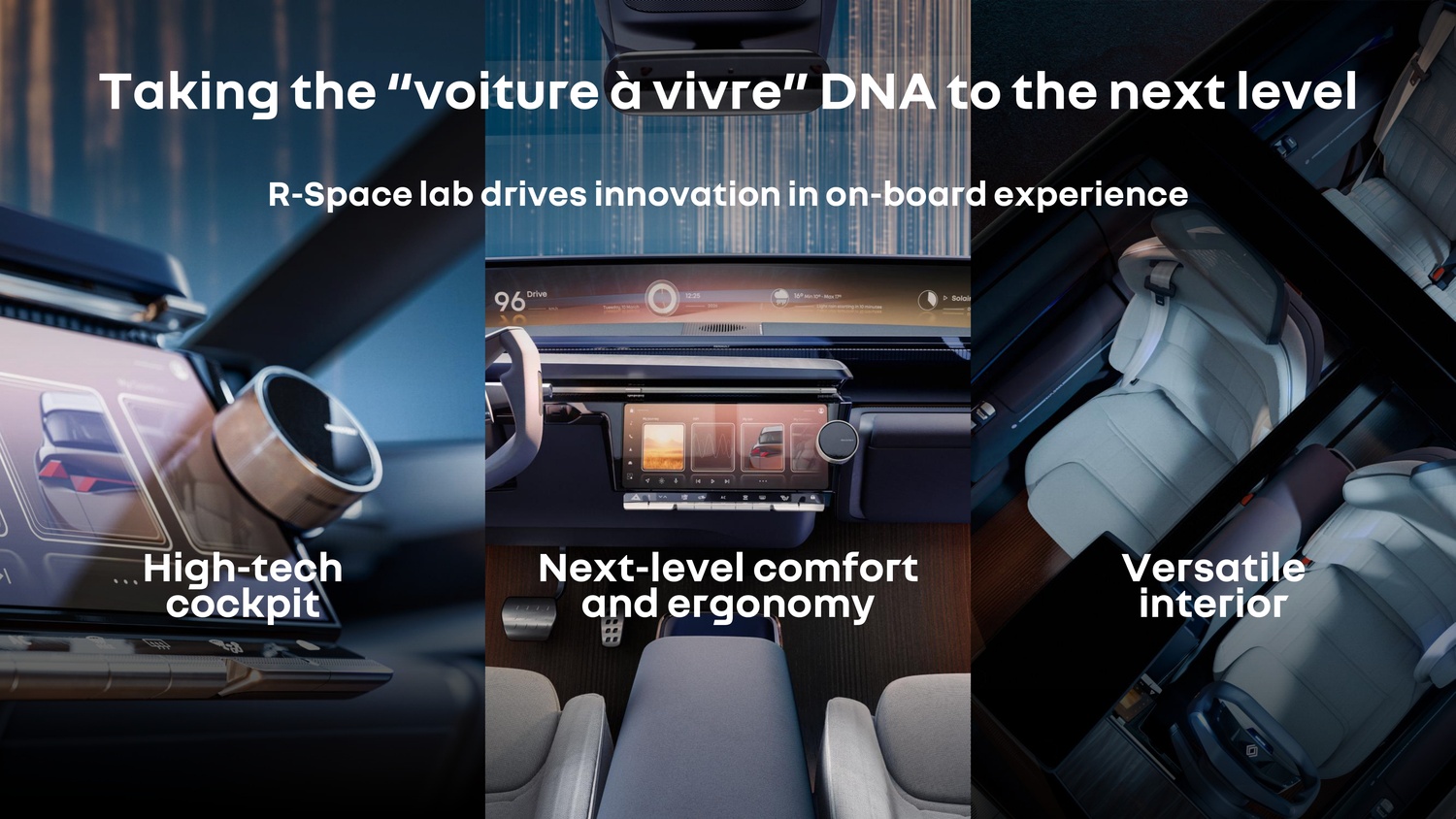 În viitor, Grupul va accelera integrarea de tehnologii noi în domenii-cheie, precum cockpituri și șasiuri inteligente, noi chimii de baterii, motoare amplasate în roți, electronică de putere, software și arhitectură electronică. Această dinamică se va baza pe expertiza internă și pe parteneriate strategice. Pentru a capta inovațiile și a le transforma în avantaje competitive reale, Renault Group va continua să se sprijine pe rețeaua sa internațională de centre de cercetare și dezvoltare (R&D).