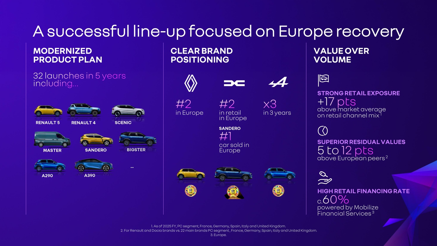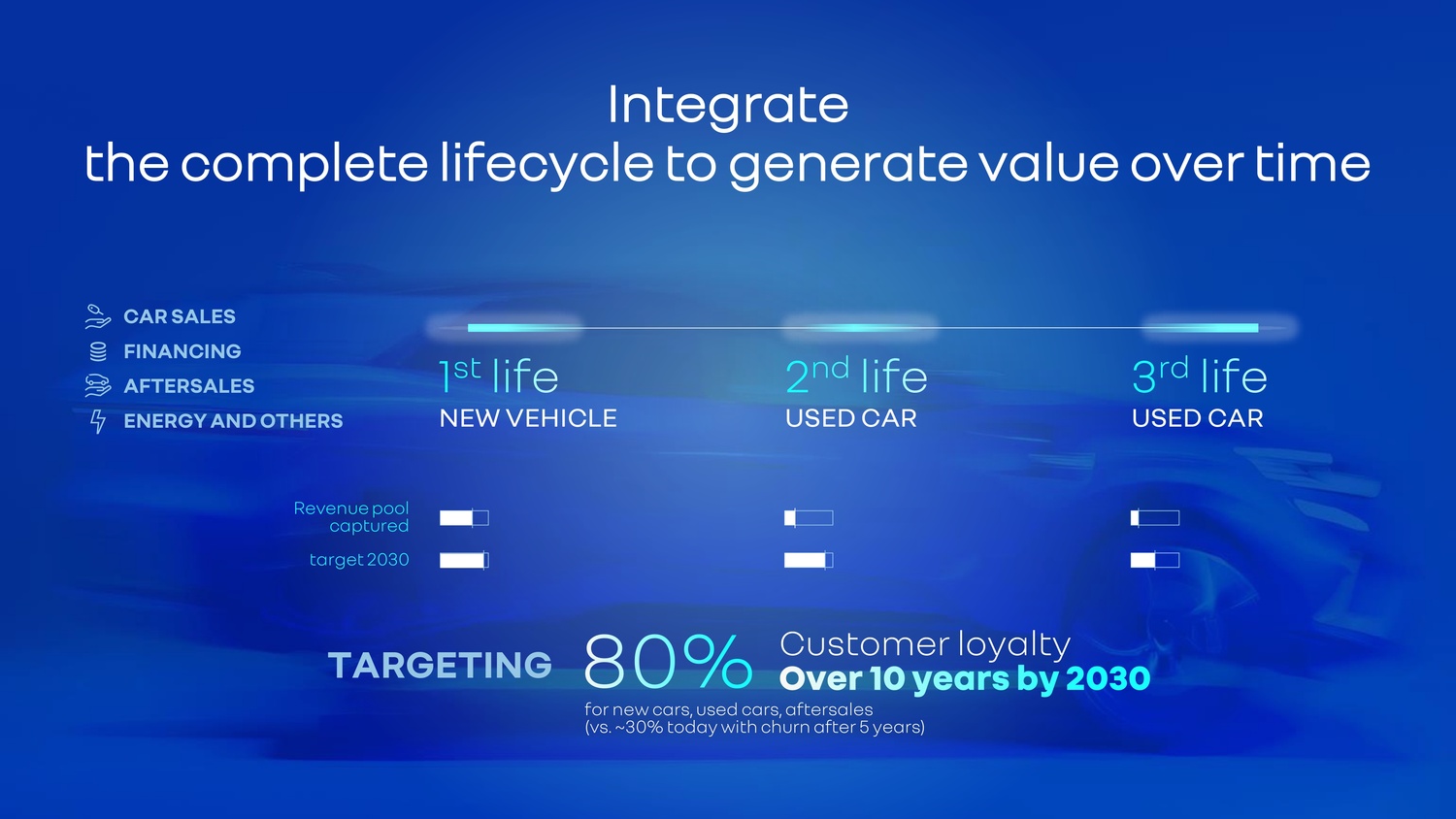 Fiecare etapă din durata de viață a mașinilor vândute trebuie să ofere o valoare percepută puternică pentru clienți și să devină, de asemenea, o sursă de optimizare a veniturilor sau de profit pentru Grup și rețeaua sa de dealeri, fie că vorbim despre vehicule noi, servicii post-vânzare, vehicule second-hand, finanțare cu MFS (Mobilize Financial Services) sau energie.