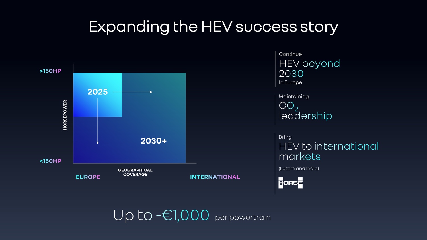 Pentru vehiculele hibride (HEV), Renault Group va continua dezvoltarea tehnologiei E-Tech după 2030, cu noi versiuni sub 150 CP și cu extindere pe piețele din afara Europei, beneficiind de o reducere semnificativă a costurilor.