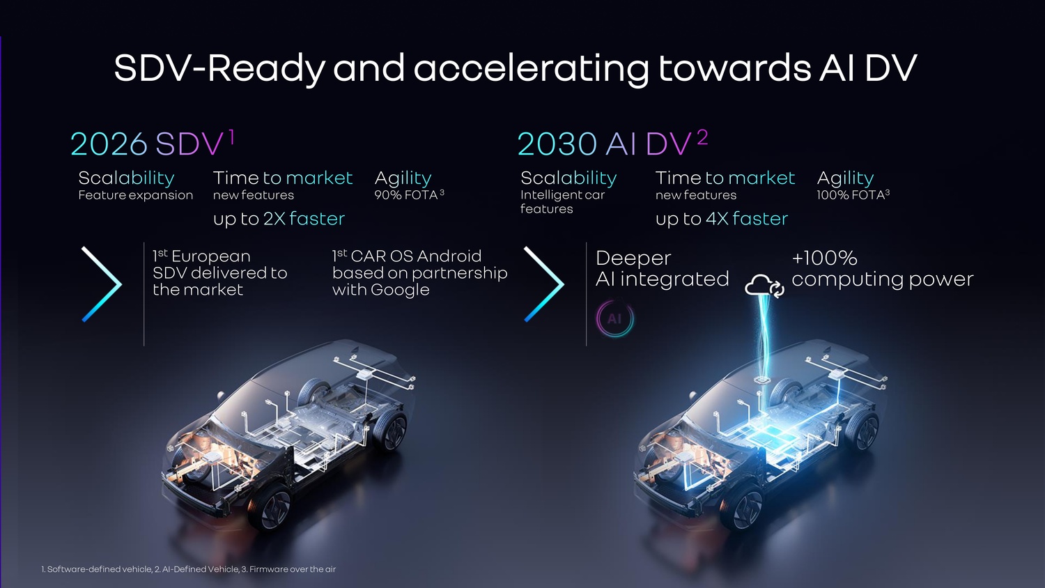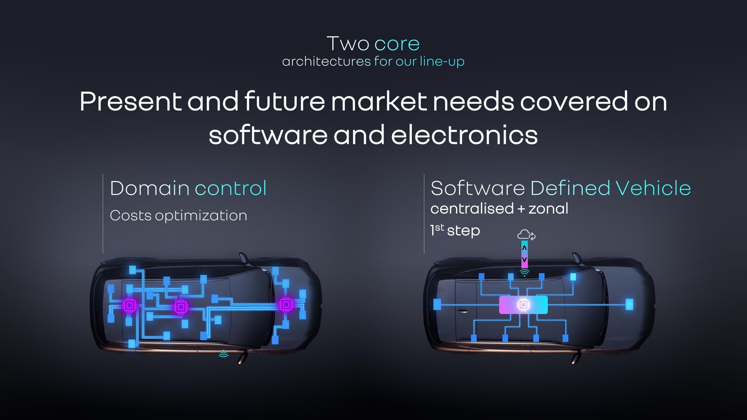 - Prin arhitectura electronică centralizată de tip Software Defined Vehicle (SDV), 90% dintre funcționalități vor putea fi actualizate FOTA (Firmware Over The Air), reducând la jumătate timpul de introducere a noilor funcții. Aceasta va fi, de asemenea, prima platformă care va integra carOS, sistemul de operare al vehiculului, dezvoltat în colaborare cu partenerul Google pe bază Android.