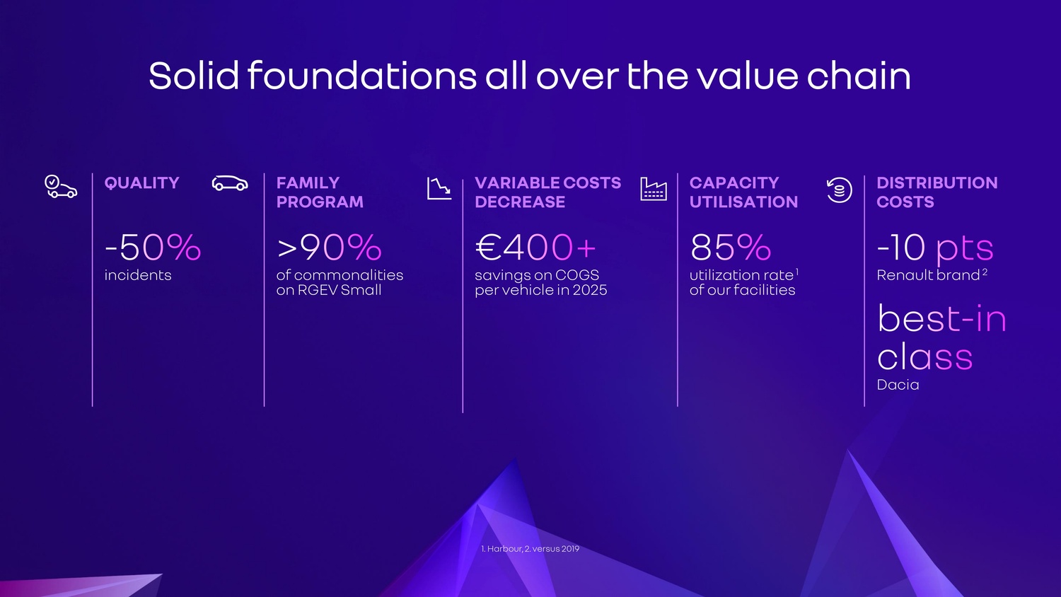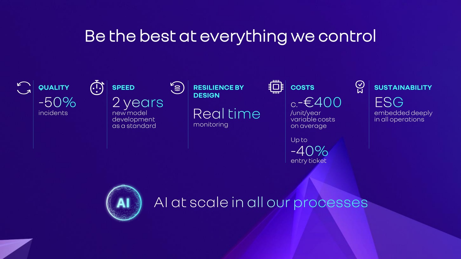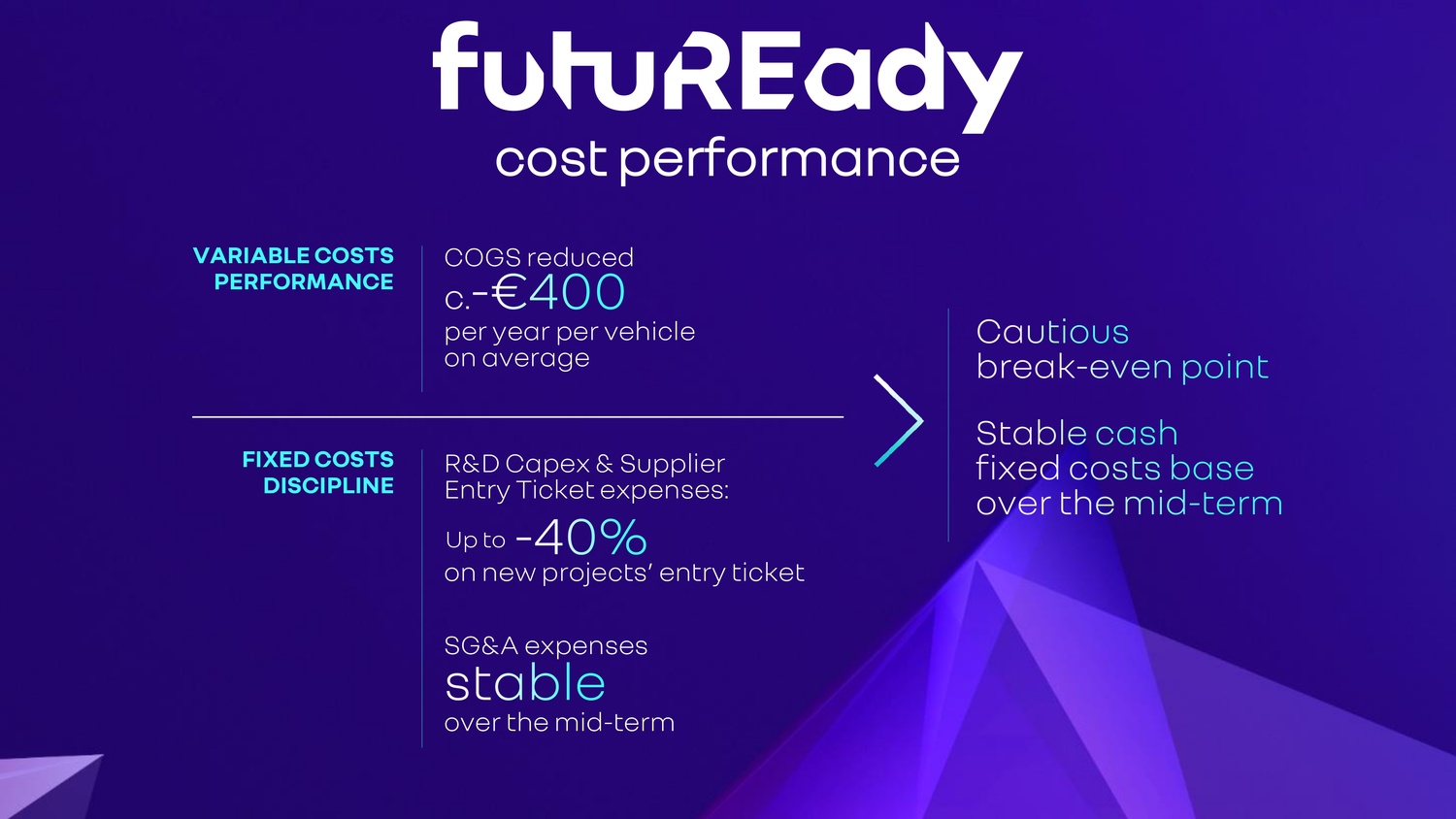 Această rigoare operațională, aplicată la toate nivelurile, va permite reducerea costurilor variabile (COGS) cu aproximativ 400 de euro per vehicul în medie pe an, diminuarea costurilor de lansare a noilor modele cu până la 40% față de generațiile precedente, menținând în același timp cheltuielile generale stabile pe termen mediu.