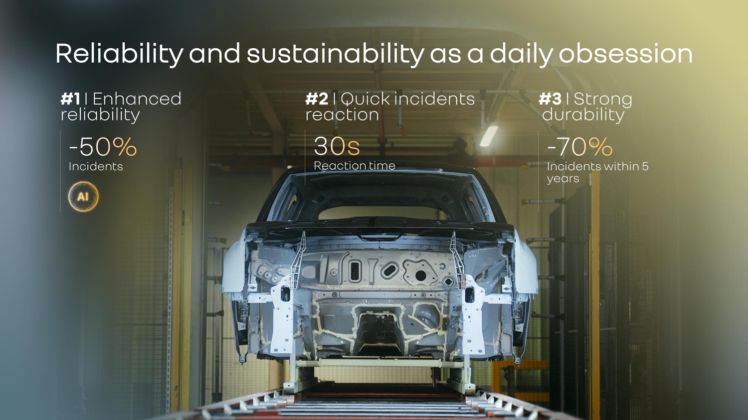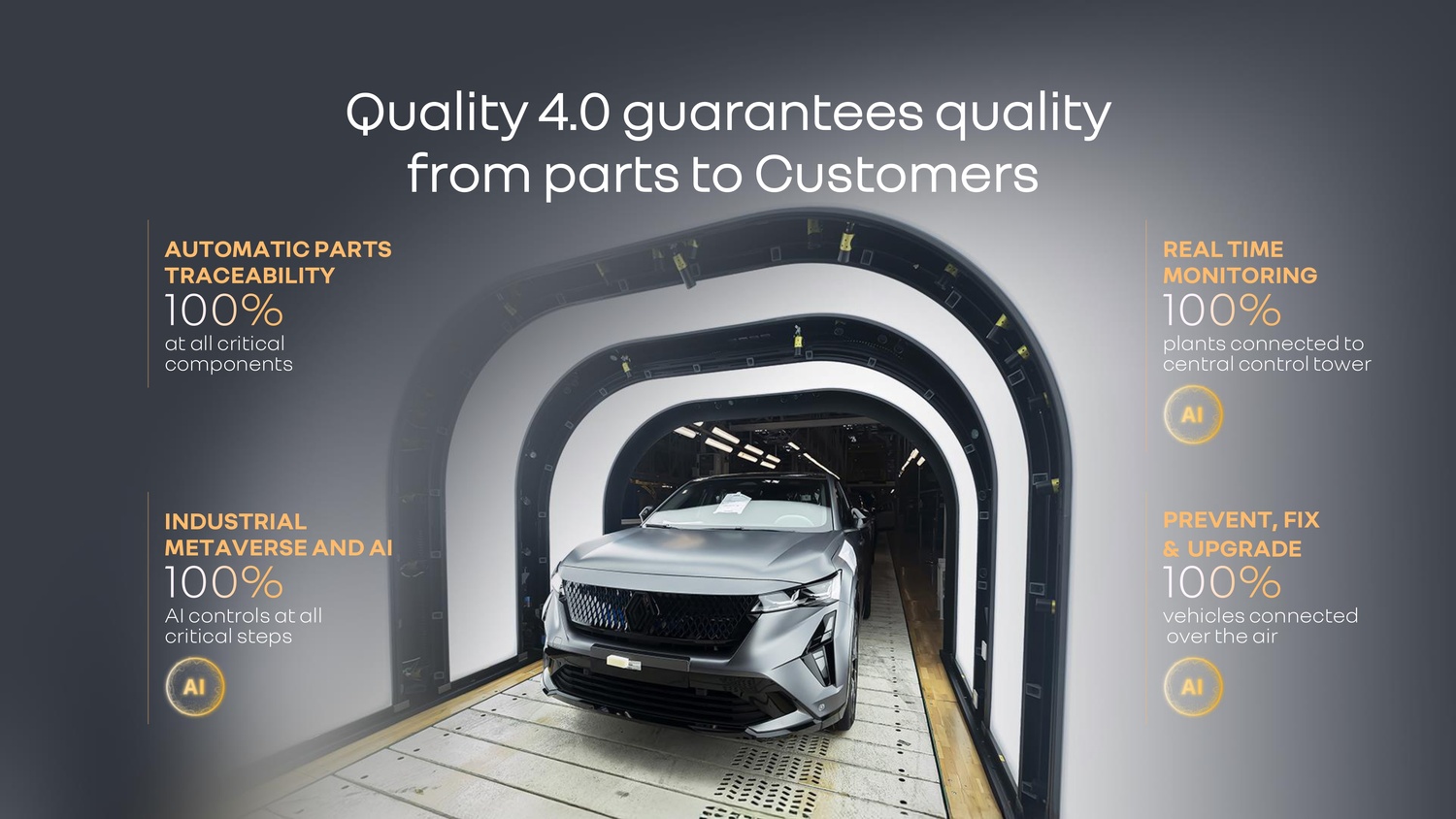 - În ceea ce privește calitatea, datorită supravegherii cu ajutorul inteligenței artificiale a 100% dintre etapele-cheie ale fabricației (adică peste 1000 de puncte de control), printr-o trasabilitate impecabilă, o capacitate mult sporită de reacție la alertele venite din rețeaua comercială și prin actualizări la distanță disponibile aproape integral, Renault Group își creează din nou premisele pentru a reduce la jumătate incidentele din primul an de utilizare și pentru a diminua de trei ori reclamațiile clienților pe un interval de cinci ani.