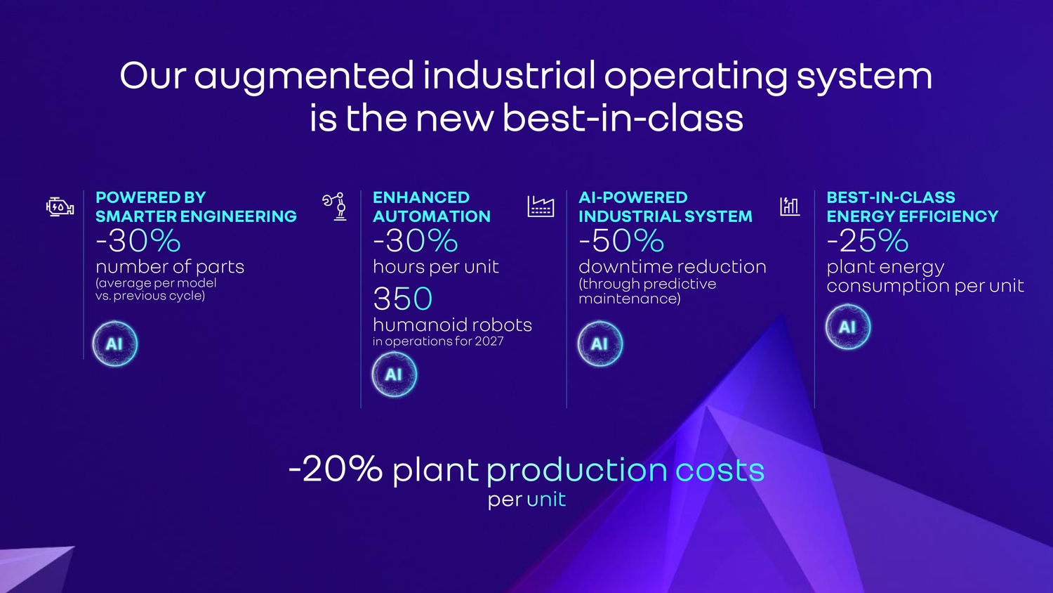 - Prin utilizarea, în medie, cu 30% a mai puține componente per vehicul, prin integrarea a 350 de roboți umanoizi de nouă generație pentru sarcinile dificile sau cu valoare adăugată scăzută și prin utilizarea AI, Renault Group își propune să înjumătățească timpii de întrerupere din uzine, să reducă consumul de energie cu 25% și să obțină o diminuare globală a costurilor de producție cu 20%.