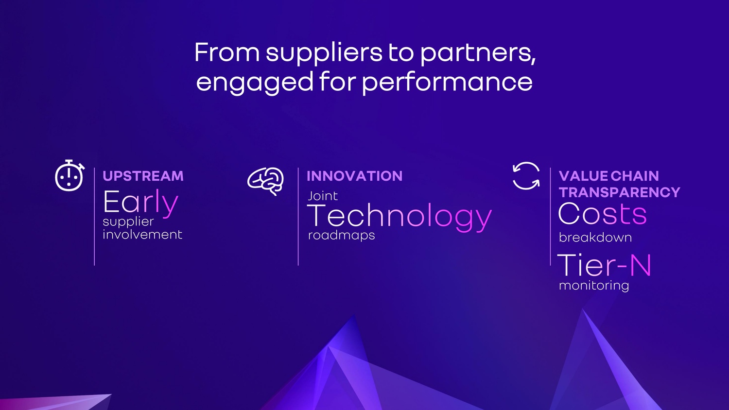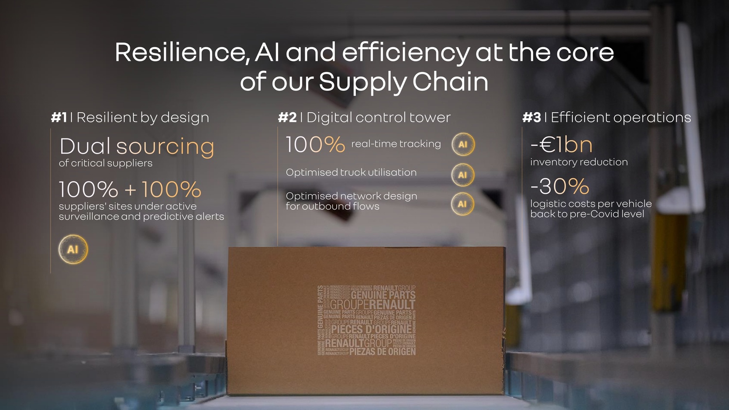 - Lanțul de aprovizionare (Supply Chain) rămâne un alt domeniu de excelență pentru Grup. Susținut de cele trei turnuri de control digitale (Inbound control tower (sosiri în uzină), outbound control tower (ieșiri din uzină) și business continuity plan), acesta poate monitoriza în timp real potențialele riscuri de-a lungul tuturor fluxurilor – atât către uzine, cât și către furnizori, pe întreg lanțul de valoare, către rețeaua comercială sau către clienți – pentru a garanta continuitatea operațiunilor și pentru a optimiza fluxurile globale, cu obiectivul de a reduce costurile logistice cu 30%.