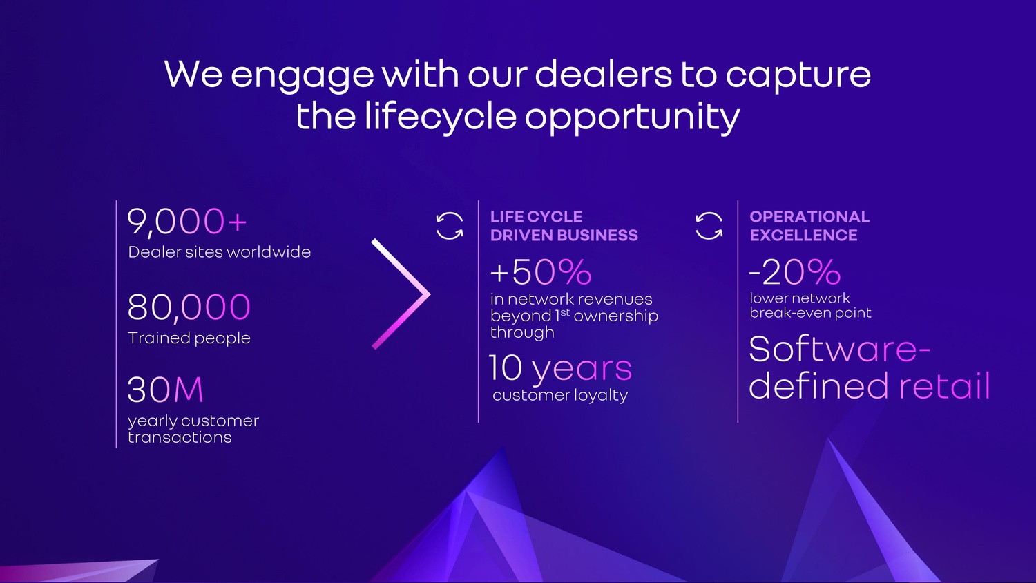 Cu cele 9000 de locații la nivel global și peste 30 de milioane de tranzacții anual, rețeaua de distribuție reprezintă pentru Renault Group principalul actor în interacțiunea cu clienții și în consolidarea satisfacției acestora. Rețeaua se află în centrul transformării prin care se creează valoare pe tot parcursul ciclului de viață al vehiculului. Tehnologiile digitale și inteligența artificială vor transforma experiența clientului și vor permite rețelei să se concentreze asupra serviciului către clienți.