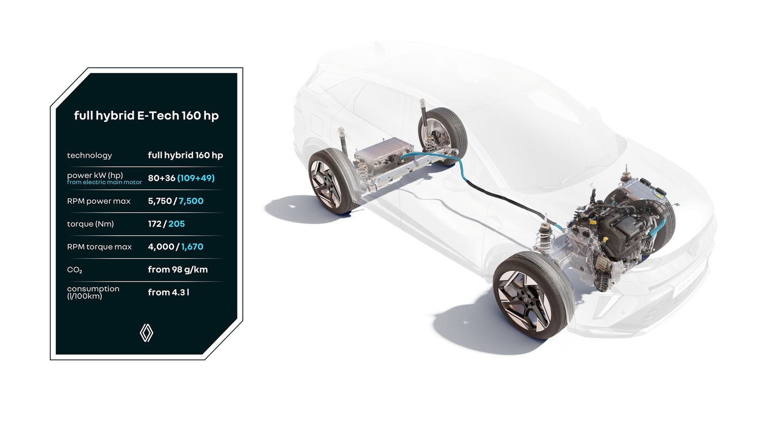 Dezvoltată din 2021 cu peste 150 de brevete, unitatea de propulsie E-Tech se bazează pe expertiza Renault în Formula 1, în special în recuperarea și regenerarea energiei. Această tehnologie permite pornirea mașinii în mod electric pentru o conducere silențioasă, cu posibilitatea de a folosi modul electric până la 80% din timp în oraș.