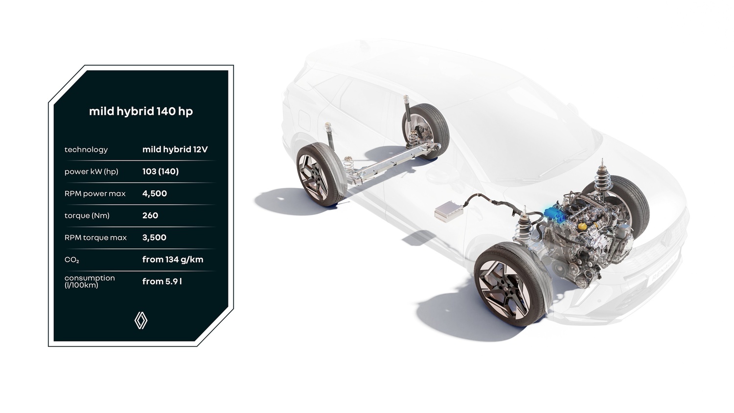 Pe lângă motorul full hybrid E-Tech 160 CP, Renault introduce pentru Symbioz un nou motor mild hybrid de 140 CP, bazat pe un motor pe benzină turbo de 1.3 litri cu injecție directă, cuplat la o cutie manuală în șase trepte.