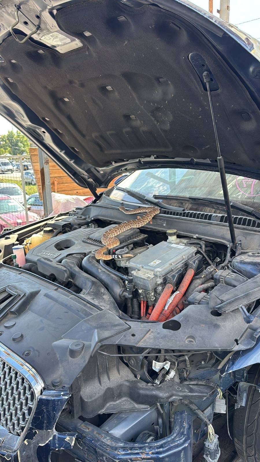 (update #1) Imagini reale cu șarpele sub capota unui Lincoln MKZ hibrid avariat. Imaginea publicată de Serviciul 112 s-a dovedit a fi una simbol.