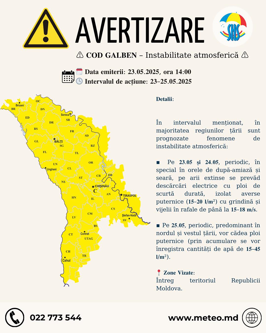 Serviciul Hidrometeorologic de Stat a emis un nou Cod Galben de instabilitate atmosferică, valabil în intervalul 15:30-23:00. Fenomenul vizează descărcări electrice însoțite de ploi de scurtă durată, care local pot fi puternice (15-20 l/m²), alături de grindină și vijelie cu rafale de până la 15-18 m/s.