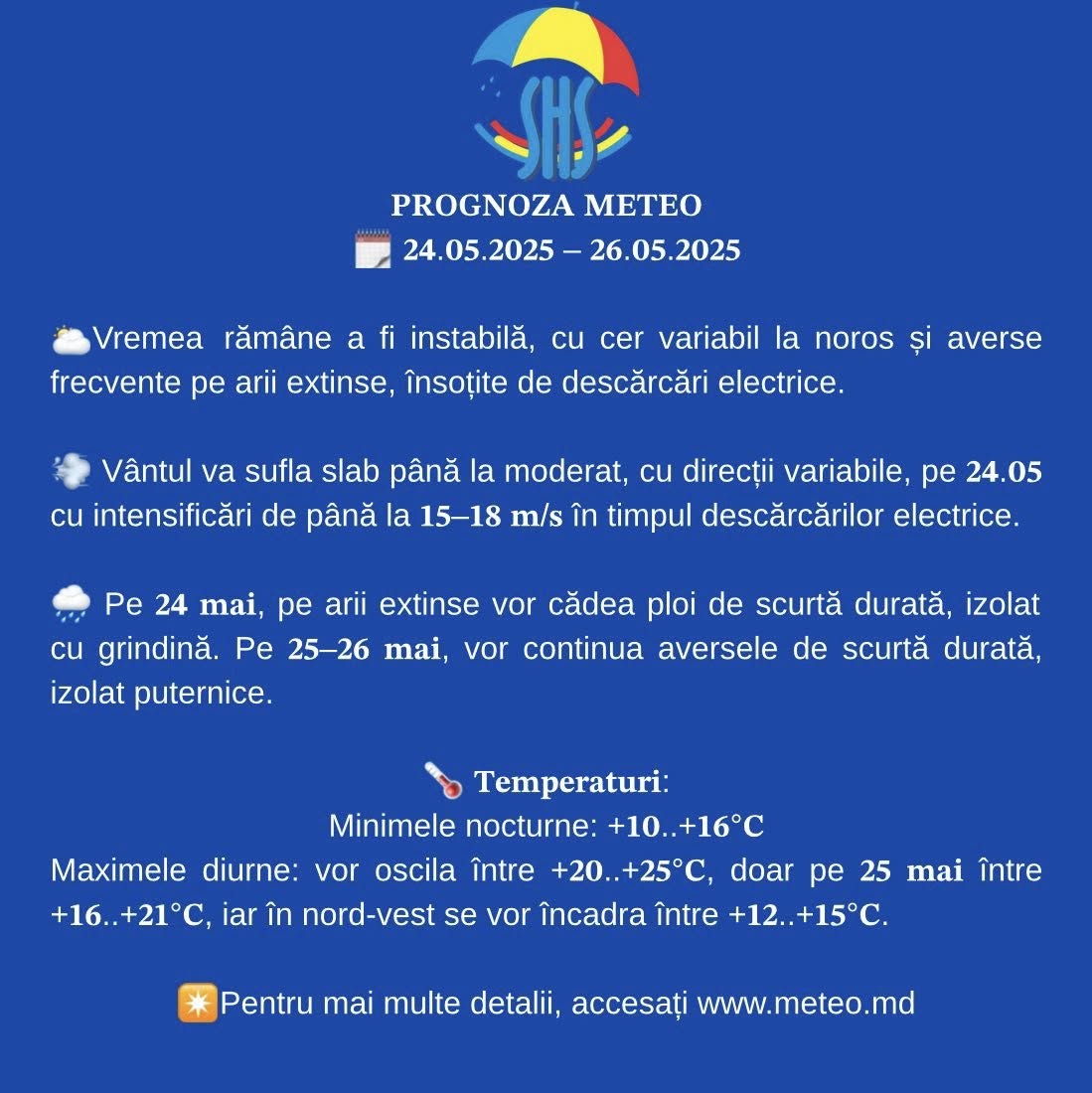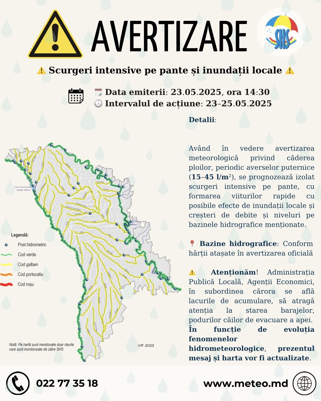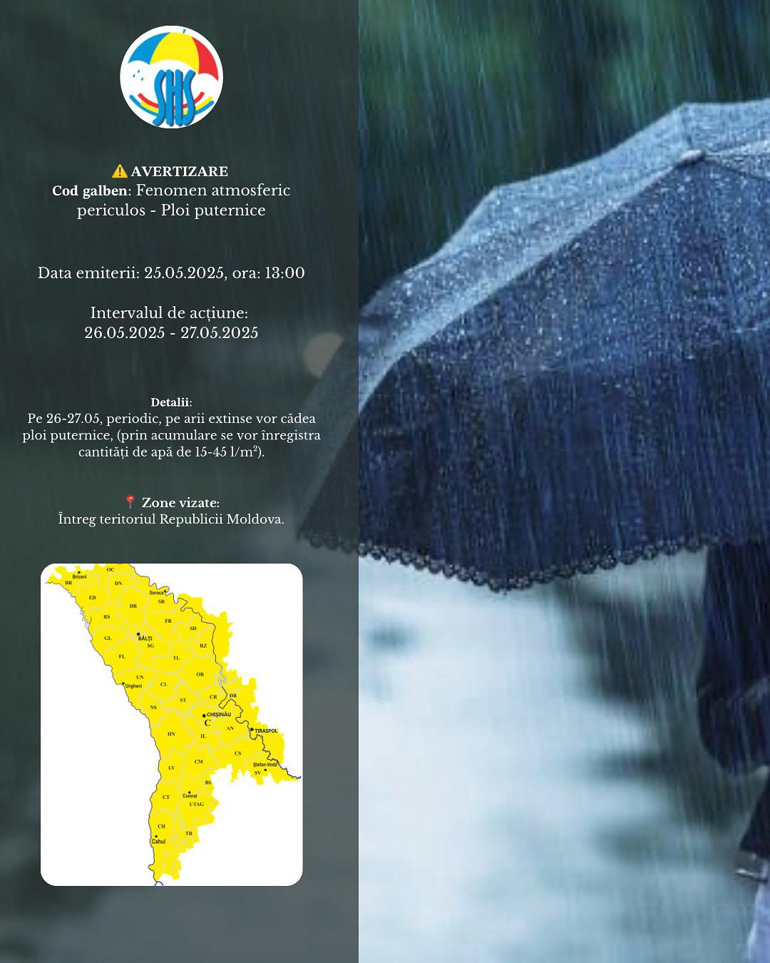Cu privire la cea meteo, mesajul SHS este: „Recomandăm cetățenilor și autorităților să ia măsuri de precauție pentru prevenirea riscurilor asociate acumulărilor de apă.”