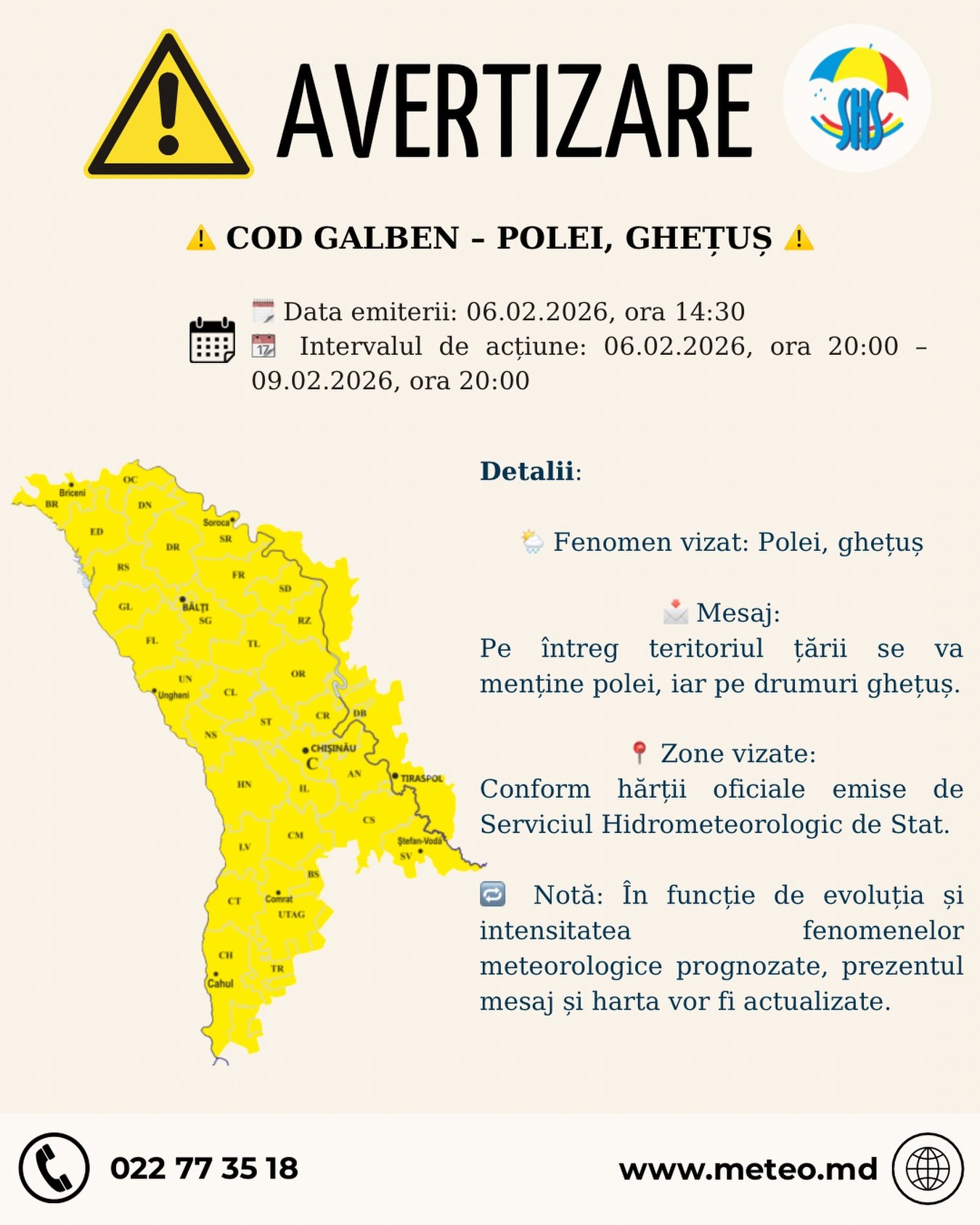 Serviciul Hidrometeorologic de Stat a emis o avertizare Cod Galben de polei și ghețuș, valabilă în intervalul 4 februarie (ora 19:00) – 6 februarie 2026 (ora 20:00). Fenomenul este cauzat de temperaturi în jur de 0°C asociate cu precipitații, predominant sub formă de ploaie, care vor favoriza formarea poleiului și ghețușului pe carosabil.
