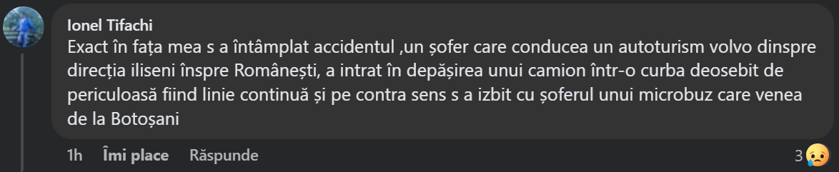 Și abia de curând s-a aflat că cei decedați sunt trei moldoveni, respectiv şoferul şi doi pasageri din maşina înmatriculată în Republica Moldova, care a intrat pe contrasens, informează Inspectoratul de poliție județean Botoșani: