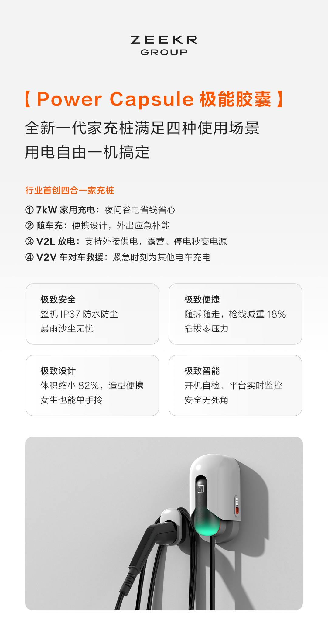 - Inovații suplimentare: Zeekr a lansat la Auto Shanghai 2025 și încărcătorul Power Capsule, o stație de încărcare casnică modulară, care are un volum redus cu 82%. Aceasta are o putere de 7 kW, încărcare portabilă, funcții V2L (vehicle-to-load) și V2V (vehicle-to-vehicle) pentru situații de urgență, urmând să intre în producție în trimestrul trei al anului curent.