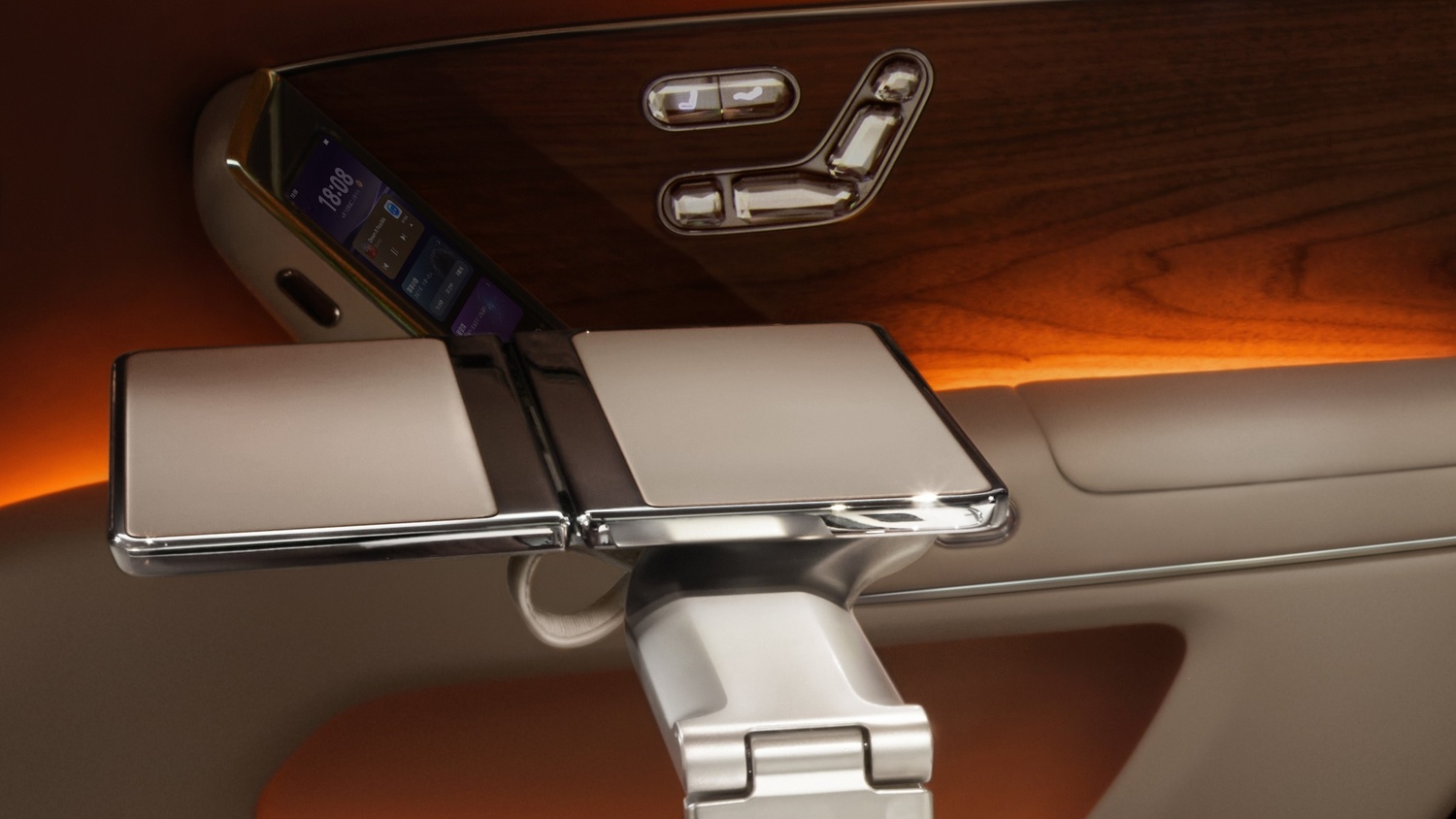 Un element central este consola de lux din spatele mașinii, care integrează măsuțe pliabile din aluminiu premium, suporturi de pahare cu funcție de încălzire/răcire, două încărcătoare wireless, un frigider cu compresor, funcții de închidere a sunetului și întunecare a habitaclului cu o singură atingere, precum și o cutie securizată cu parolă și amprentă pentru obiecte de valoare.