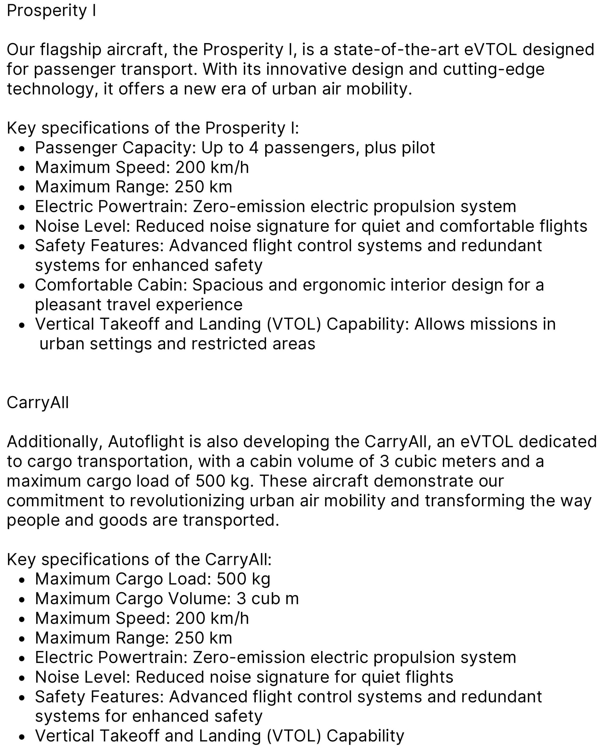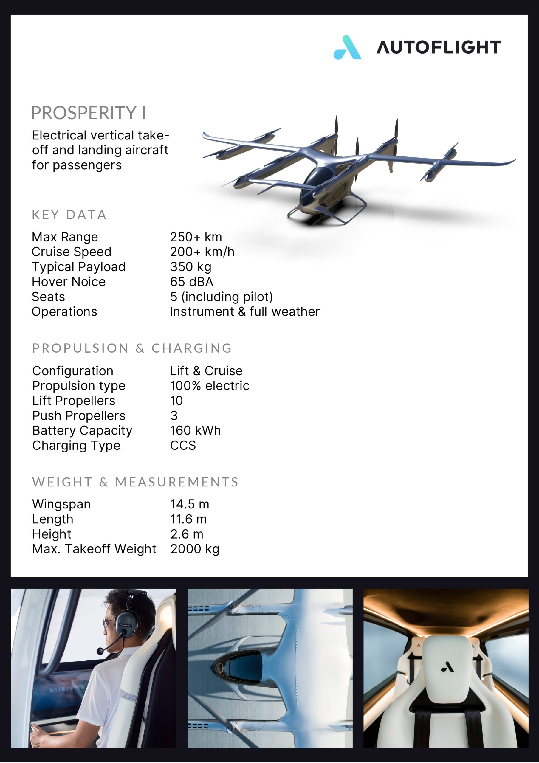 AutoFlight continuă să dezvolte portofoliul său de produse, lucrând acum la Prosperity, o aeronavă cu cinci locuri, controlată de un pilot, aflată în proces de certificare de navigabilitate. Mai multe planuri de certificare au primit aprobarea reglementărilor, aeronava apropiindu-se acum de etapa de verificare a conformității.